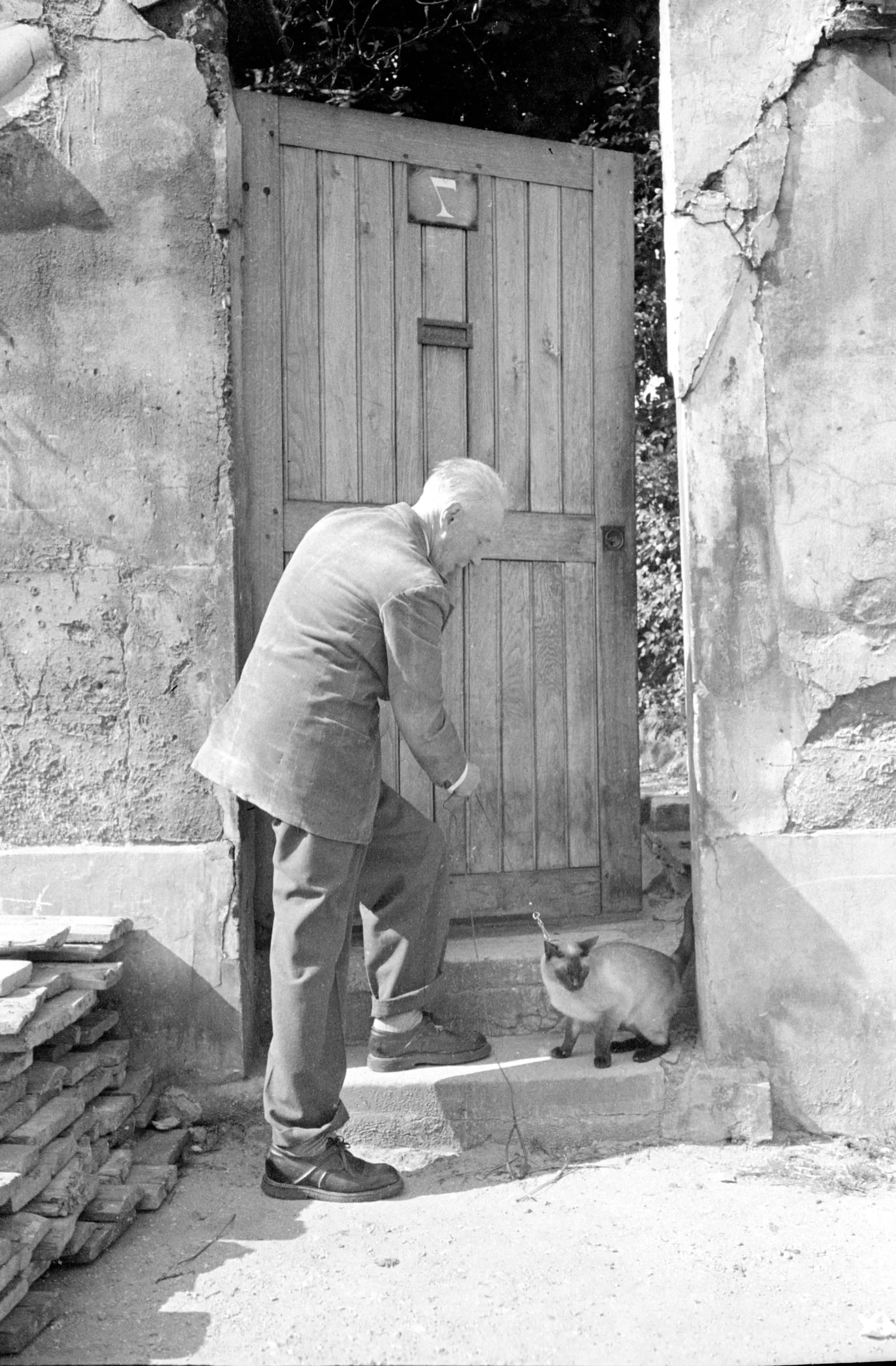 Black and white photograph of an older white-haired man bending toward a Siamese cat on a stone step before a weathered wooden door