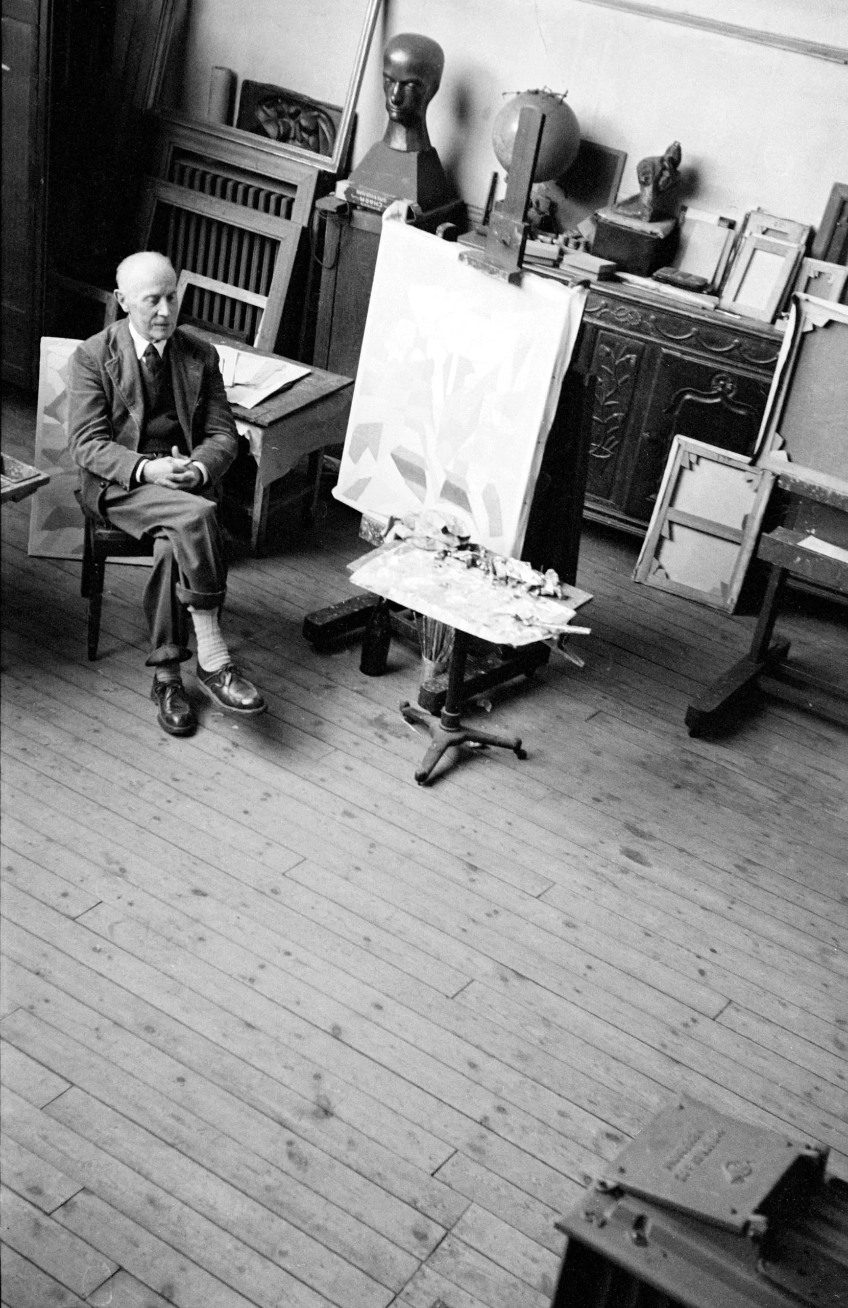 Black and white photograph looking down into an artist's studio, an elderly white-haired man in a dark suit seated beside a large easel holding an abstract canvas