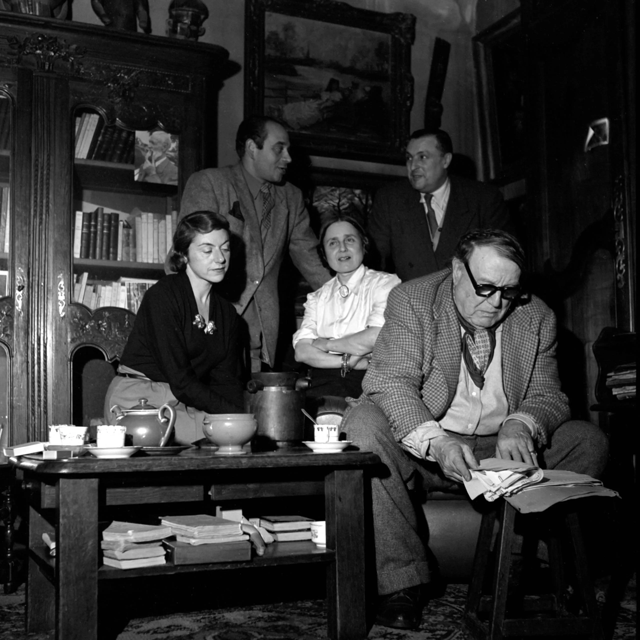 Black and white photograph of five adults gathered around a low table set with teacups and teapots in a book-lined room