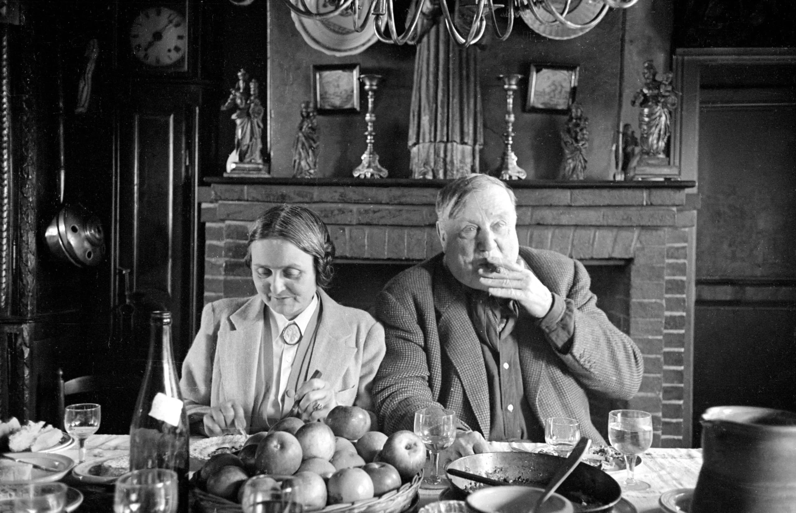 Black and white photograph of a man and woman seated at a table laden with fruit and glassware, with a brick fireplace and decorative mantel behind them