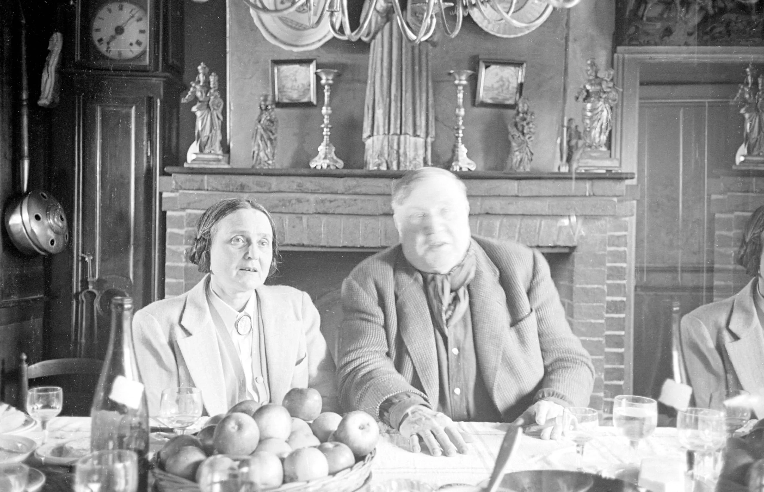 Black and white photograph of a man and woman seated at a dining table with fruit and glassware, a fireplace mantel with figurines behind them