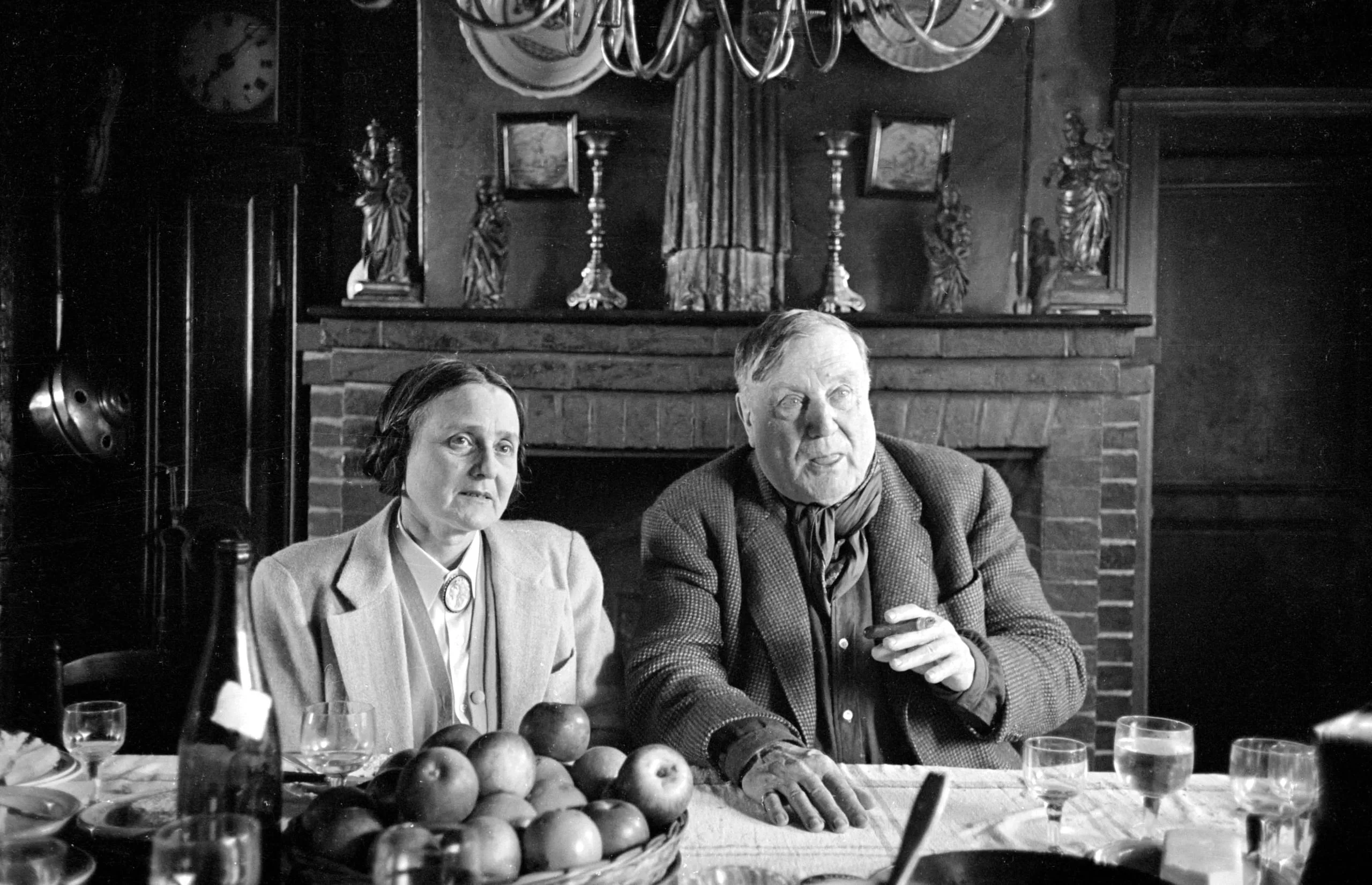 Black and white photograph of a man and woman seated at a cloth-covered dining table with fruit and glasses, a brick fireplace and chandelier behind them