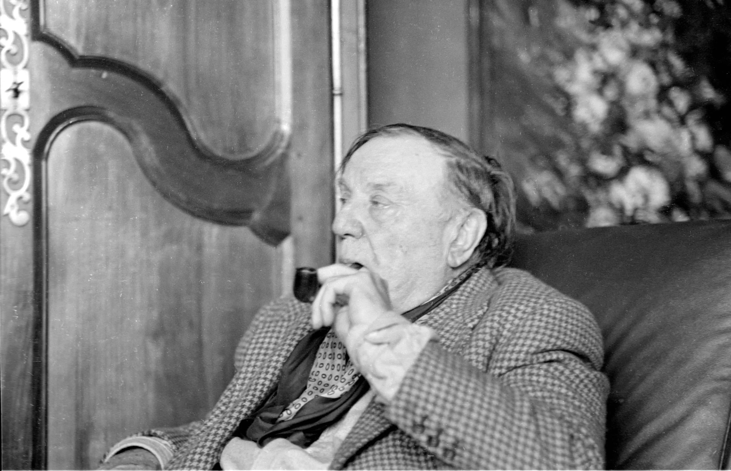 Black and white photograph of an elderly man in profile, seated in a dark armchair, holding a pipe to his lips, wearing a houndstooth sport coat