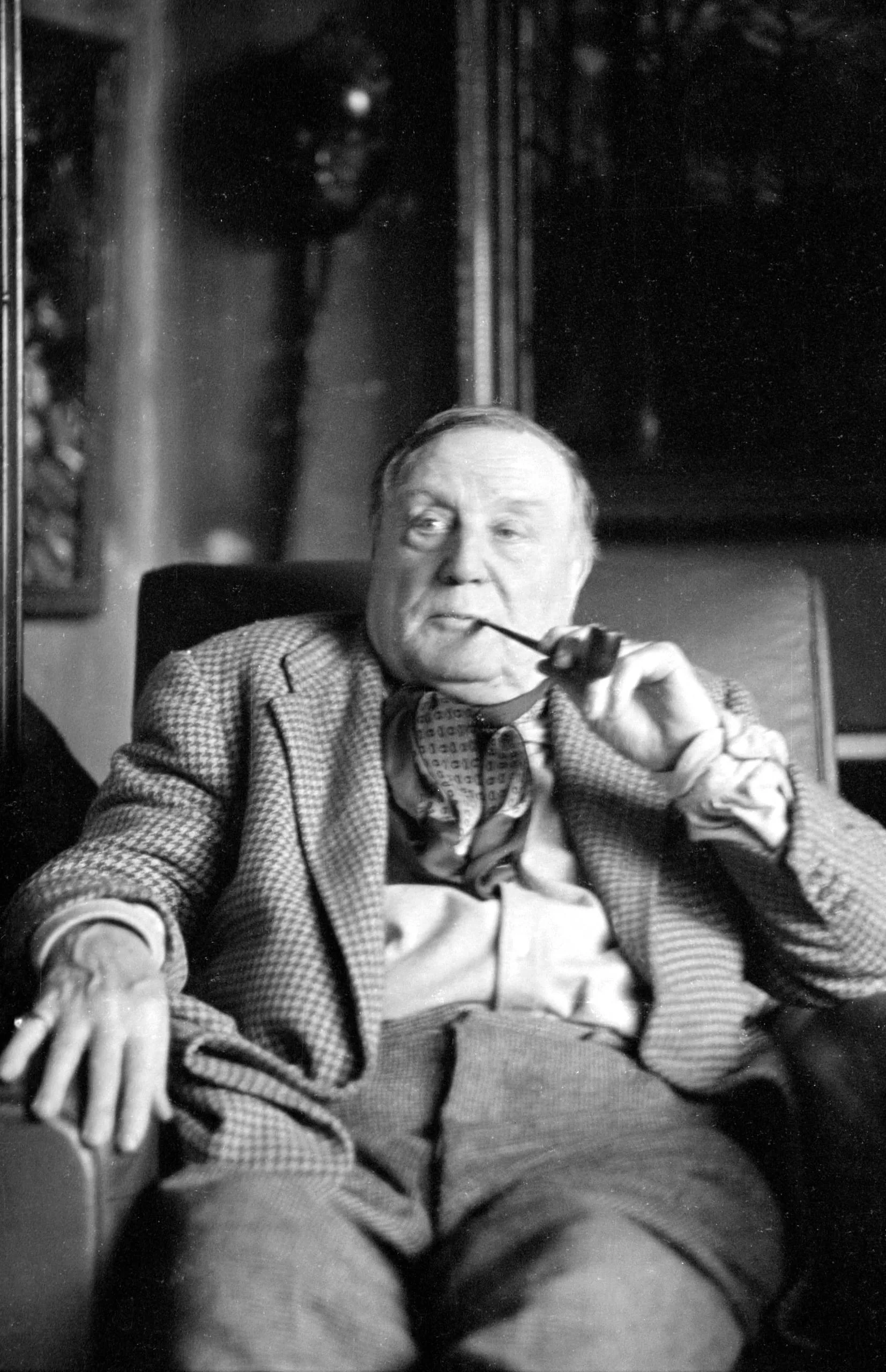 Black and white portrait photograph of a heavyset man seated in a dark armchair, wearing a houndstooth jacket and holding a pipe to his lips