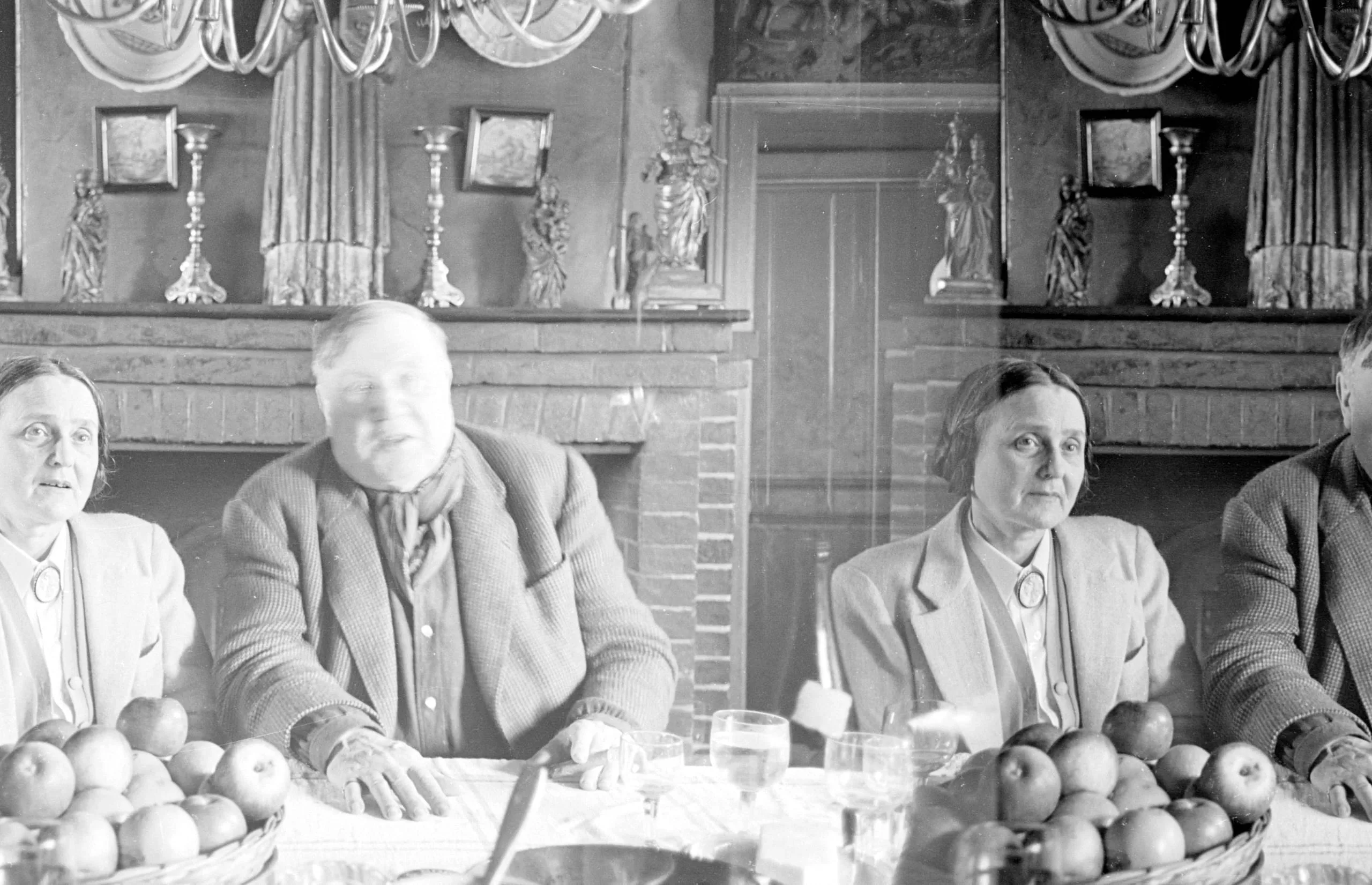 Black and white photograph of four adults — three white women and one heavyset white man — seated at a lace-covered table with baskets of apples and glasses, in a room with a brick fireplace and figurative statuettes