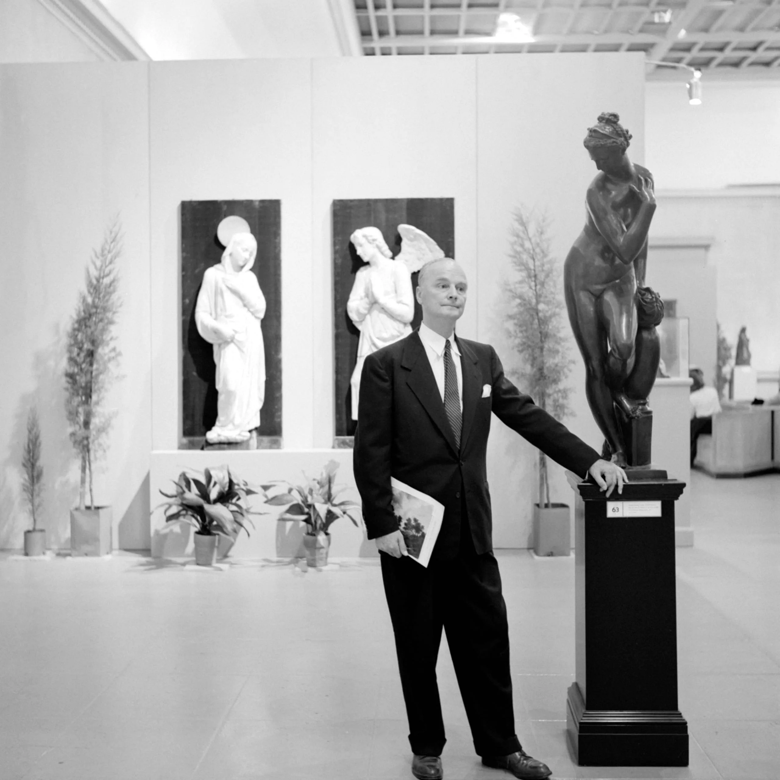 Black and white photograph of a man in a dark suit standing beside a tall pedestal with a bronze nude sculpture in a gallery, two white marble angel reliefs mounted on dark panels behind him