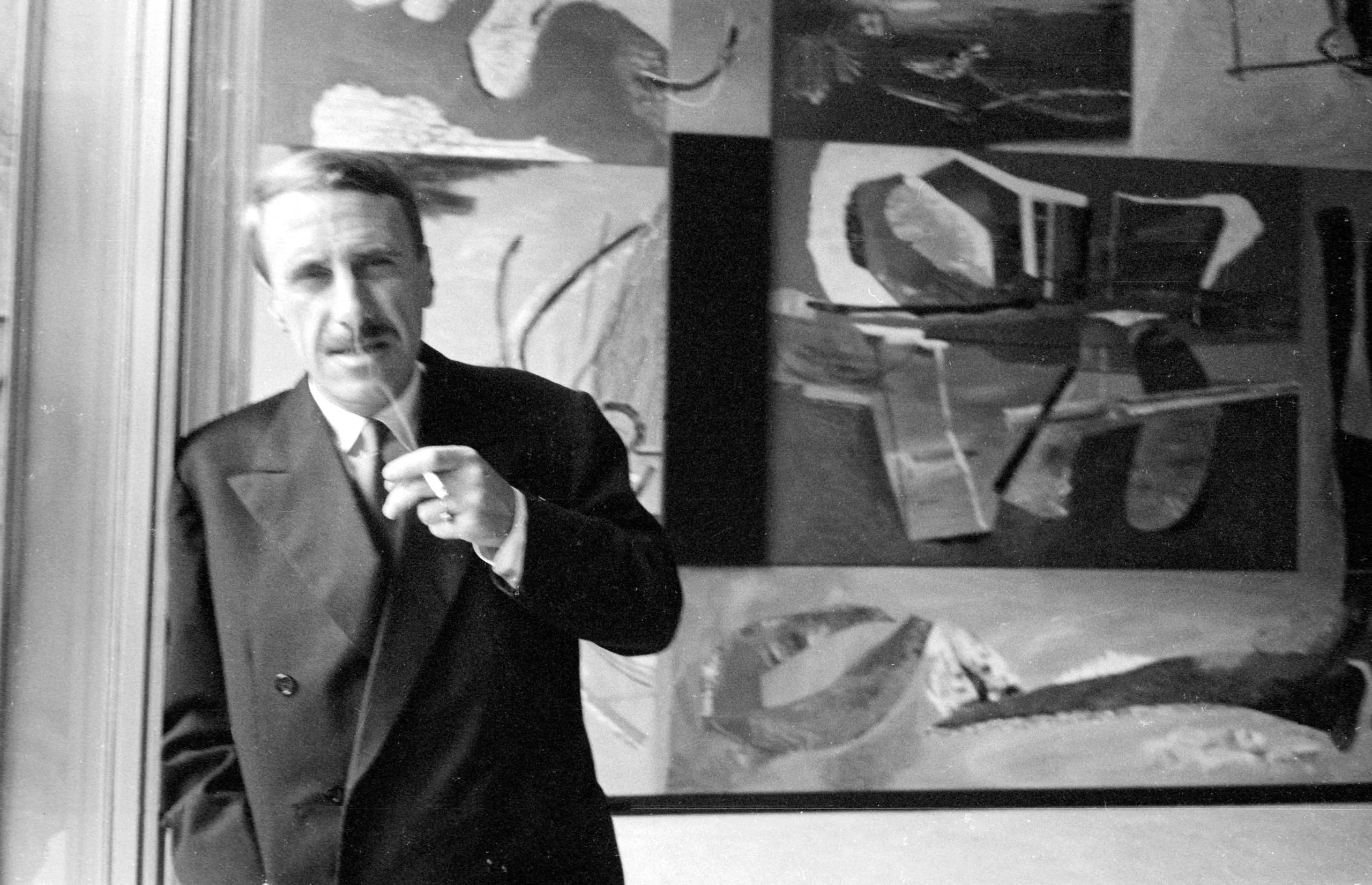 Black and white photograph of a white man in a dark suit pointing at the camera with a cigarette in hand, standing before several large abstract paintings