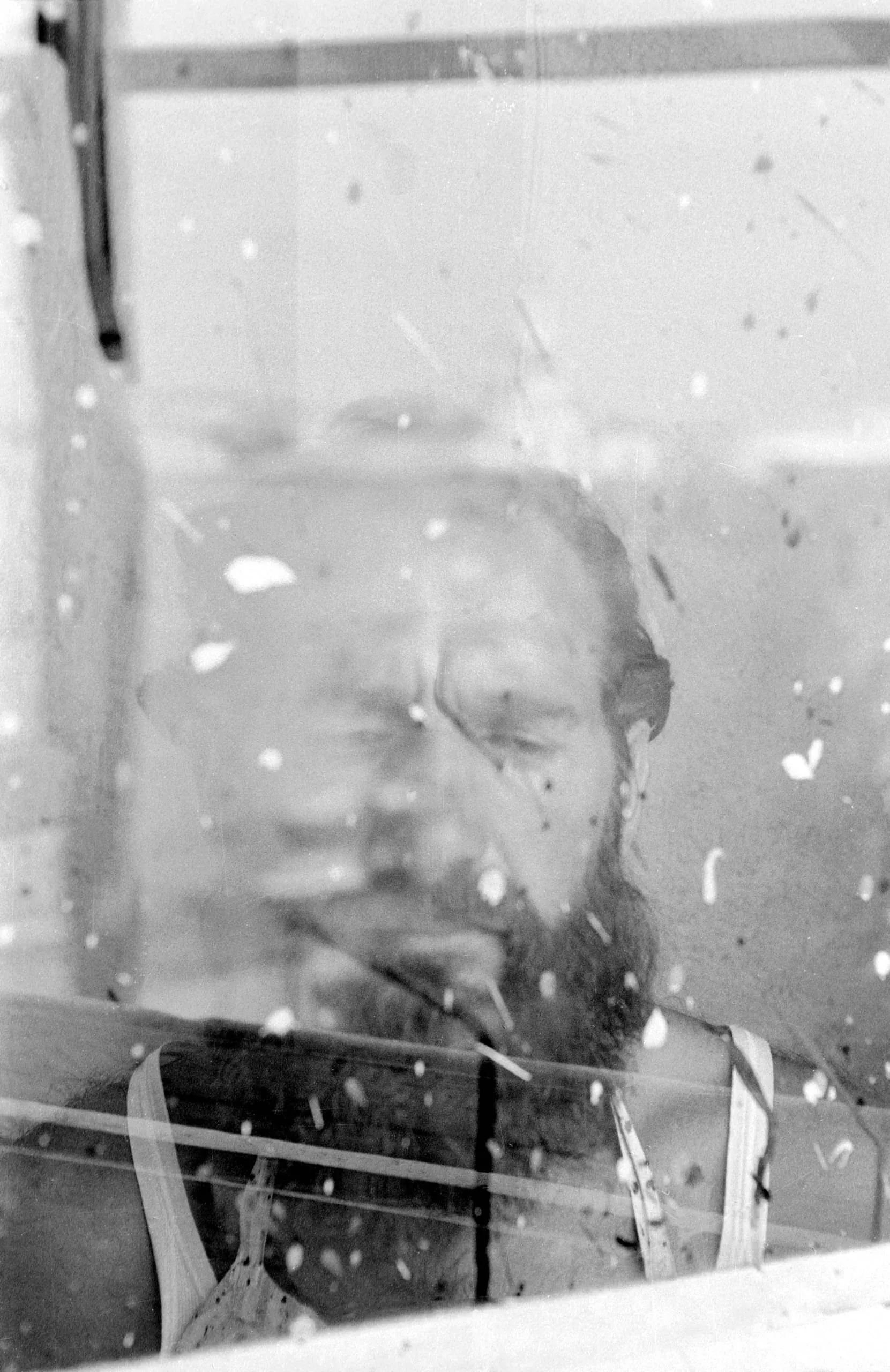 Black and white photograph of a bearded man with closed eyes, seen through a water-droplet-covered pane of glass