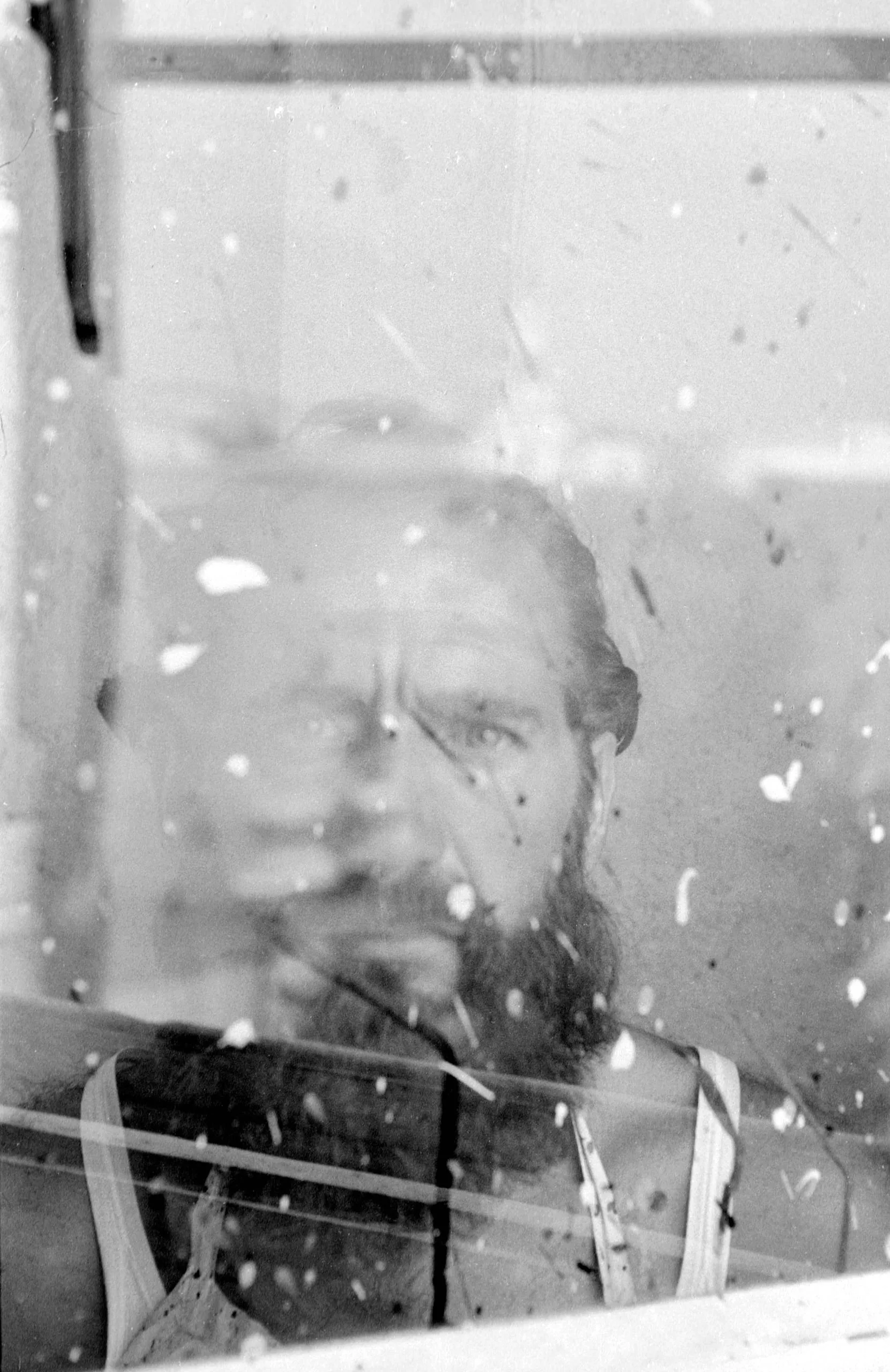 Black and white photograph of a bearded man with pale skin seen through a dirty, scratched glass window pane