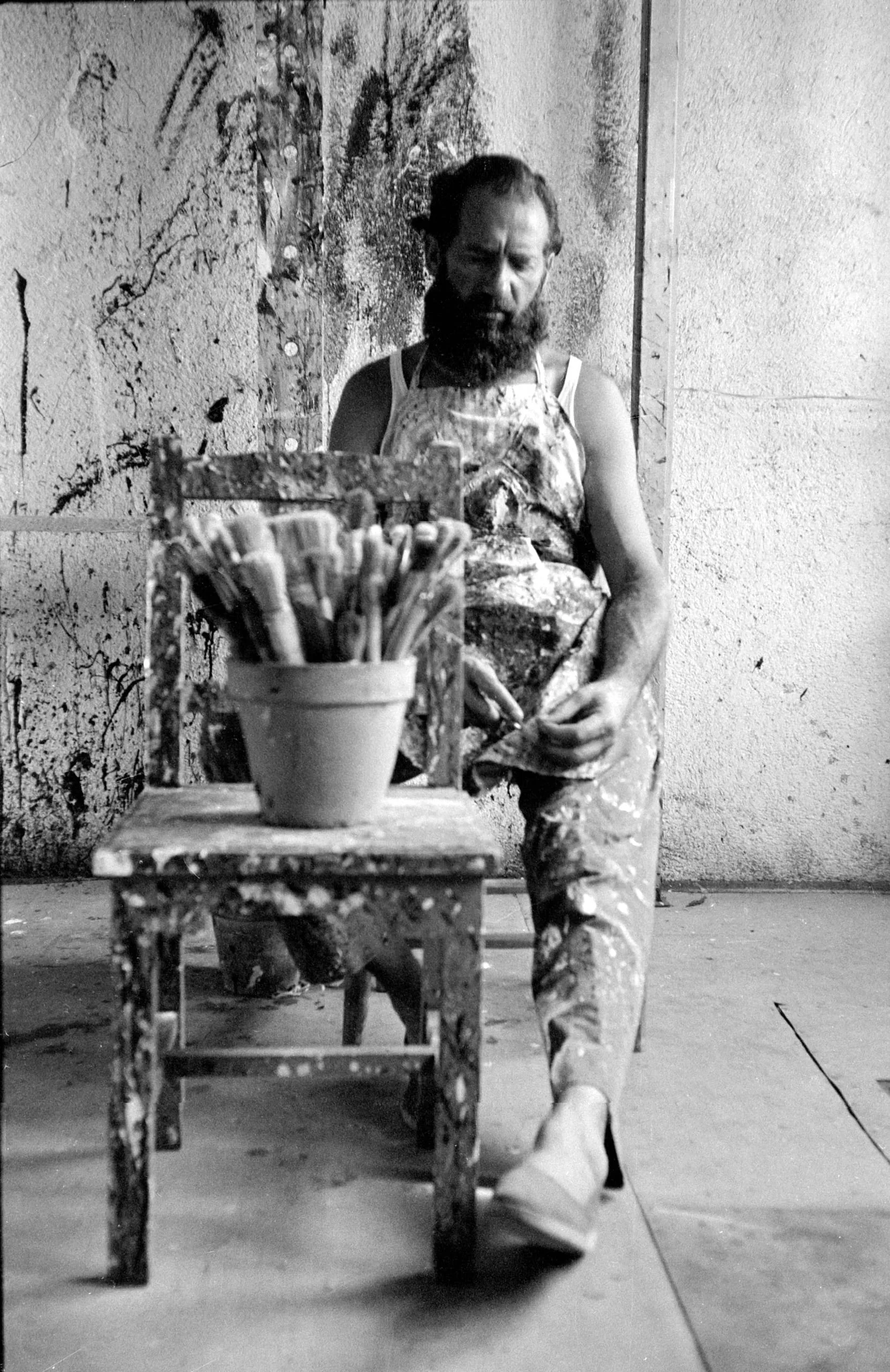 Black and white photograph of a bearded man in a paint-splattered apron standing beside a paint-covered chair holding a pot of paintbrushes, in front of a splattered studio wall