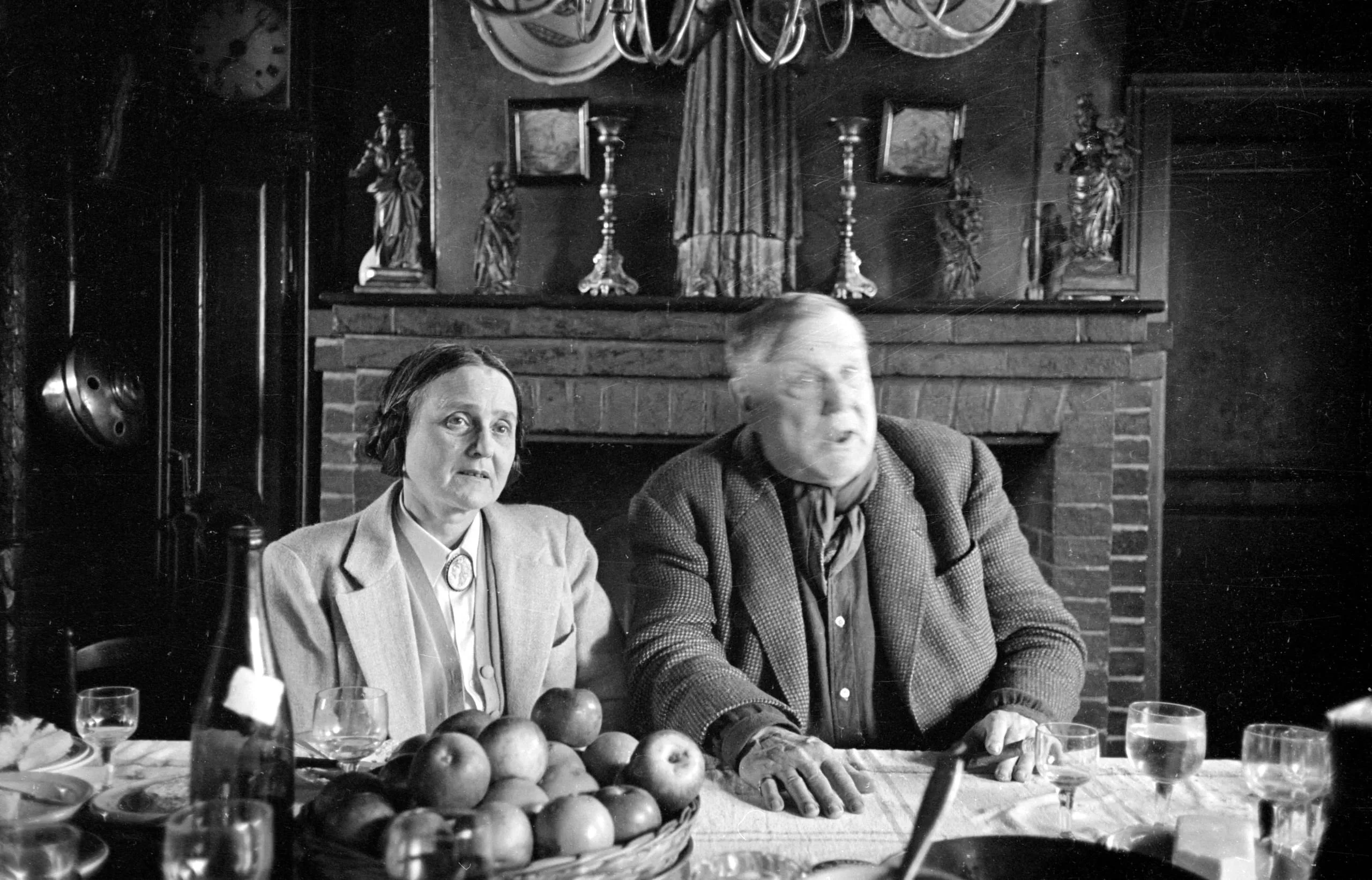 Black and white photograph of a white woman and man seated at a dining table laden with fruit and glasses, a brick fireplace with figural statuettes visible behind them