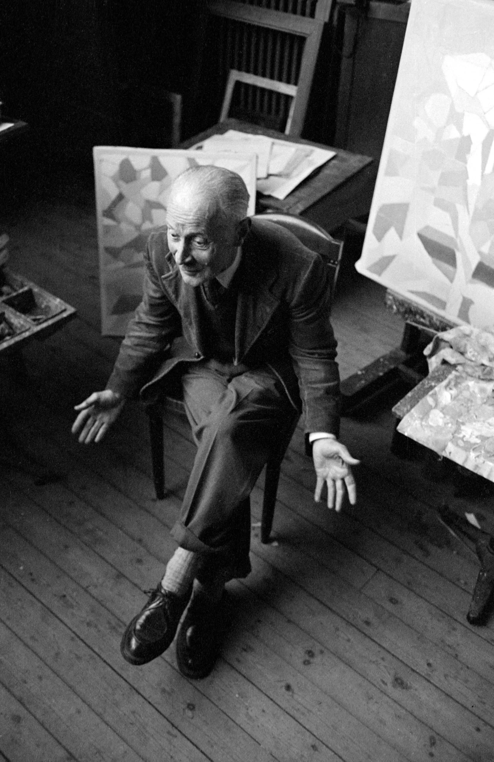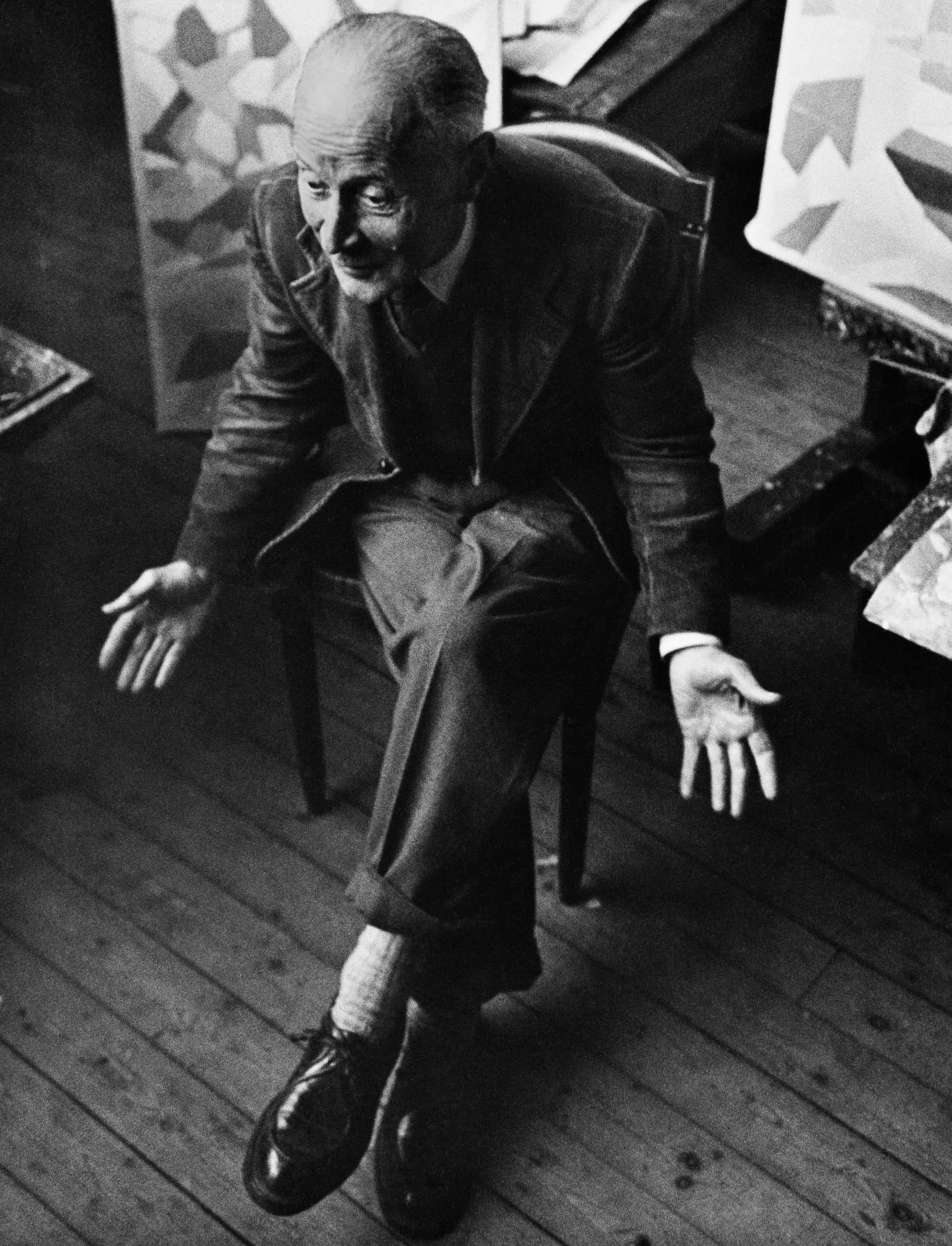 Gelatin silver print, overhead view of an elderly man in a dark suit seated on a wooden chair, hands open and gesturing, surrounded by geometric abstract paintings on a wooden studio floor.