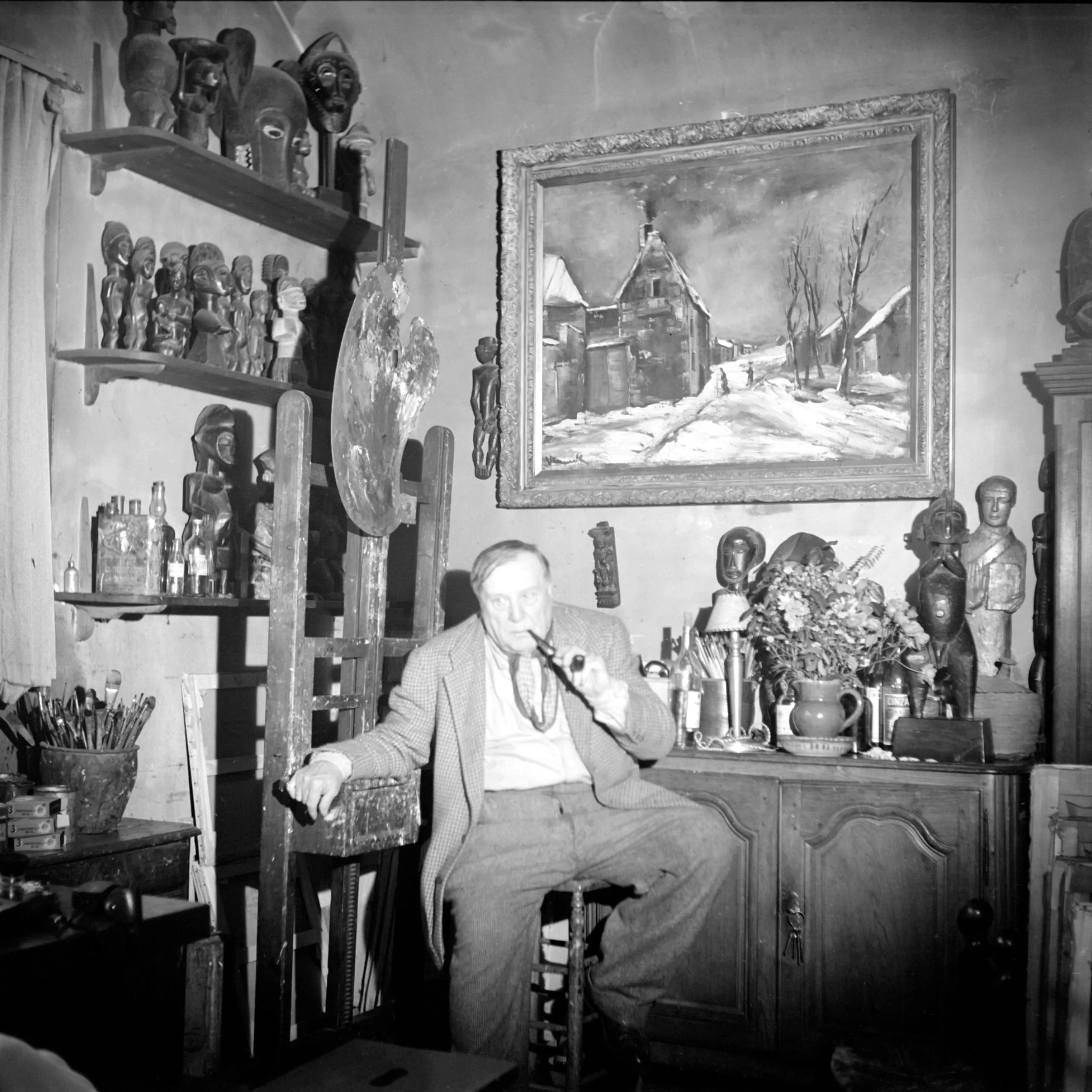Black and white photograph of a man smoking a pipe seated in an artist's studio crowded with African sculptures, a paint-covered easel, and a framed winter landscape painting on the wall