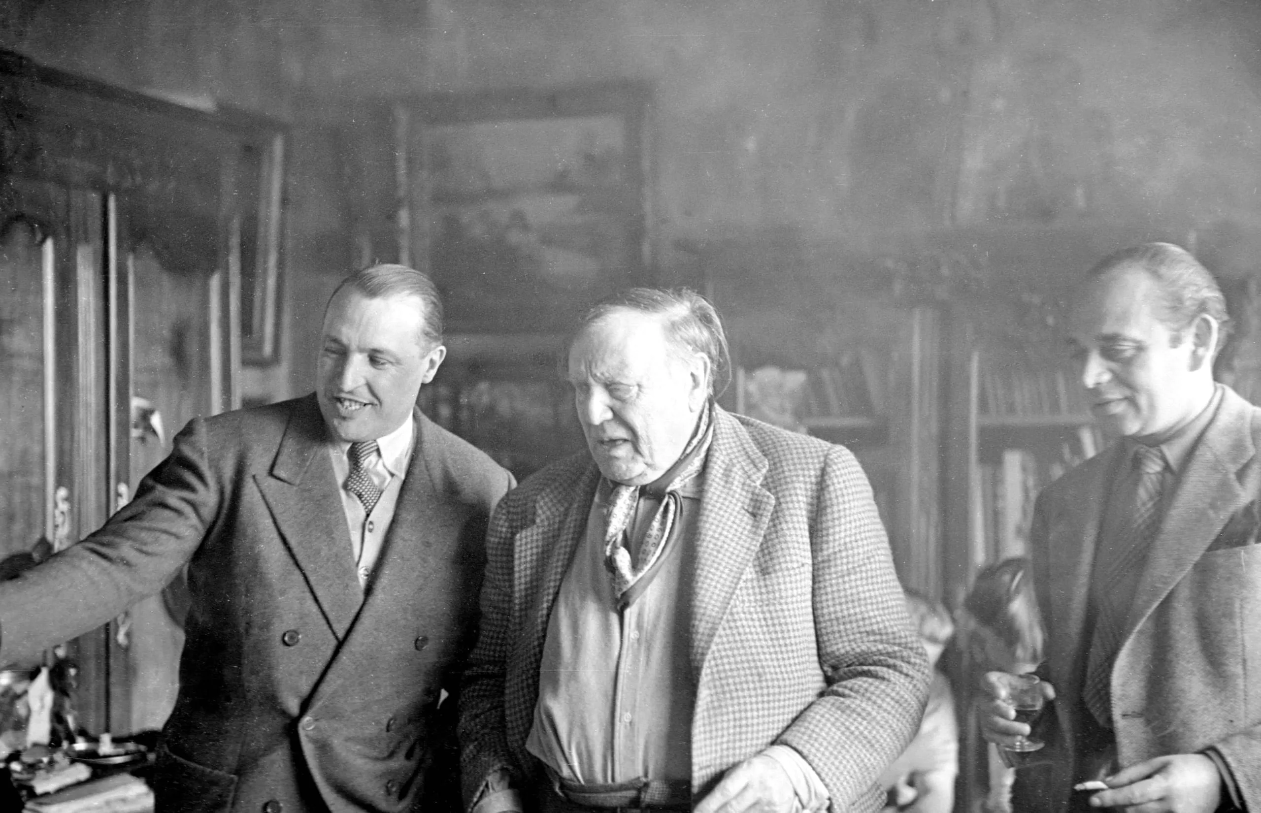 Black and white photograph of three white men in suits standing together indoors, laughing and talking, with bookshelves and framed pictures visible behind them