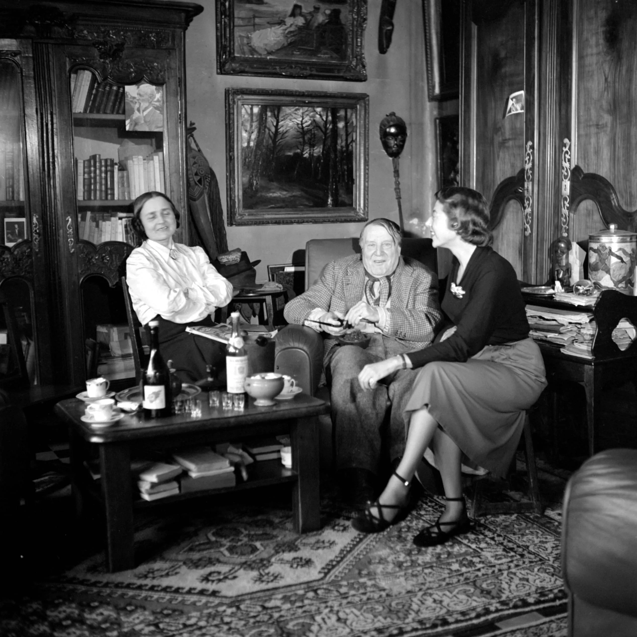 Black and white photograph of three adults seated in a cluttered sitting room with bookshelves, paintings, and a low table holding glasses and a bottle