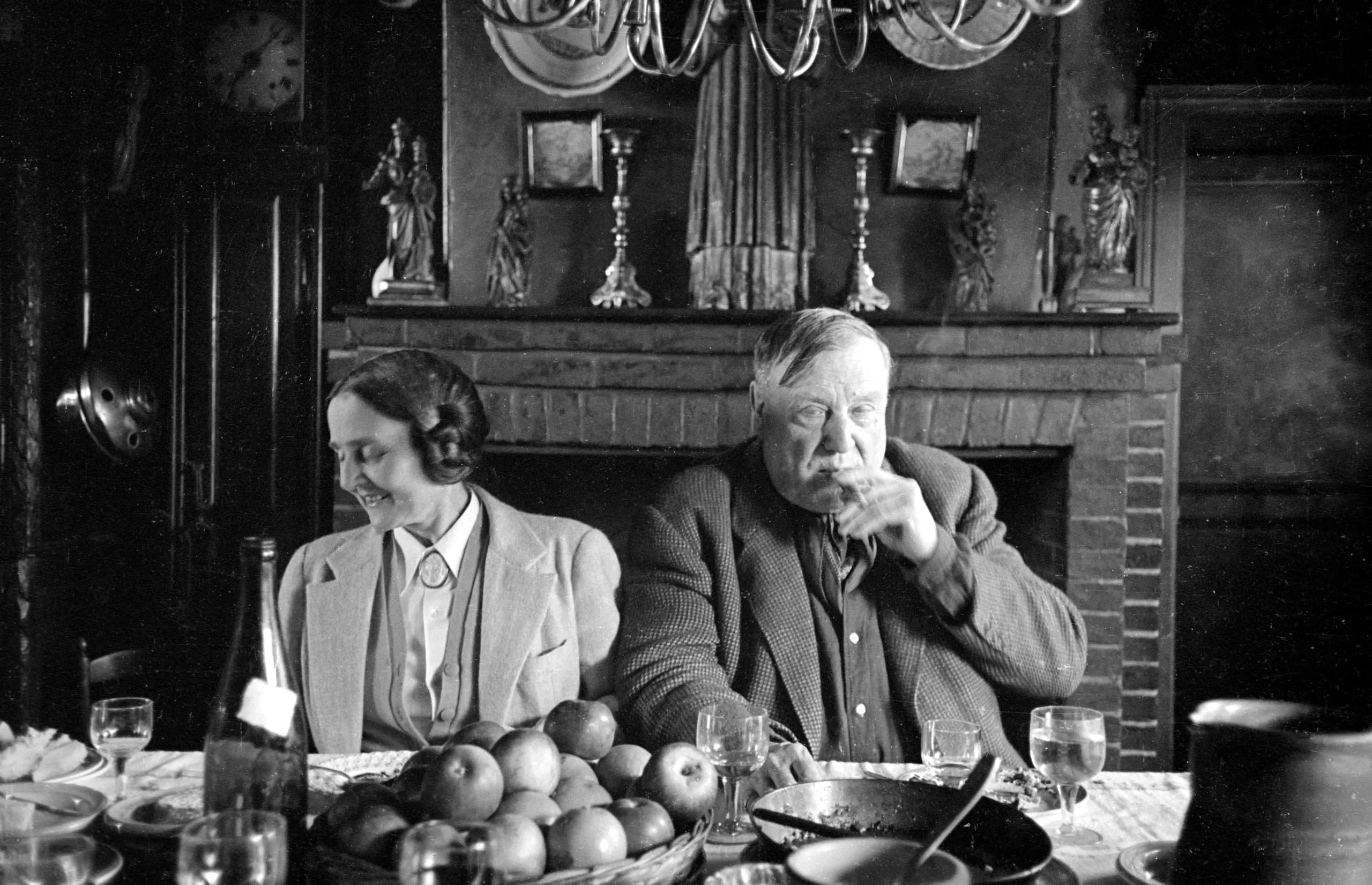 Black and white photograph of a man and woman seated at a table laden with fruit and glassware, a fireplace and mantelpiece visible behind them