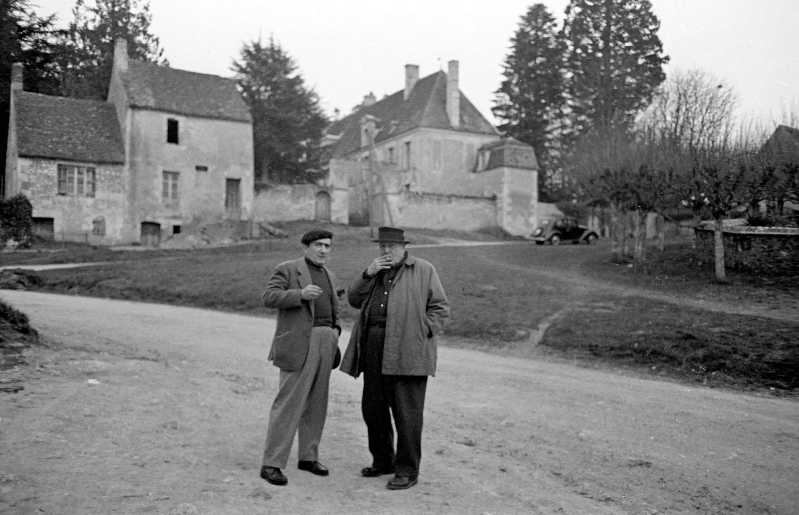 Black and white photograph of two men standing on a rural dirt road, stone village buildings visible behind them on an overcast day