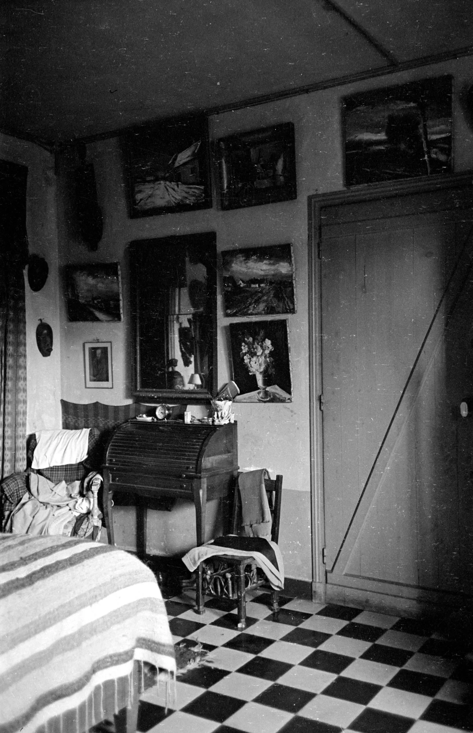 Black and white photograph of a cluttered interior room with checkerboard tile floor, a roll-top desk, salon-hung paintings, a mirror, and a striped bed