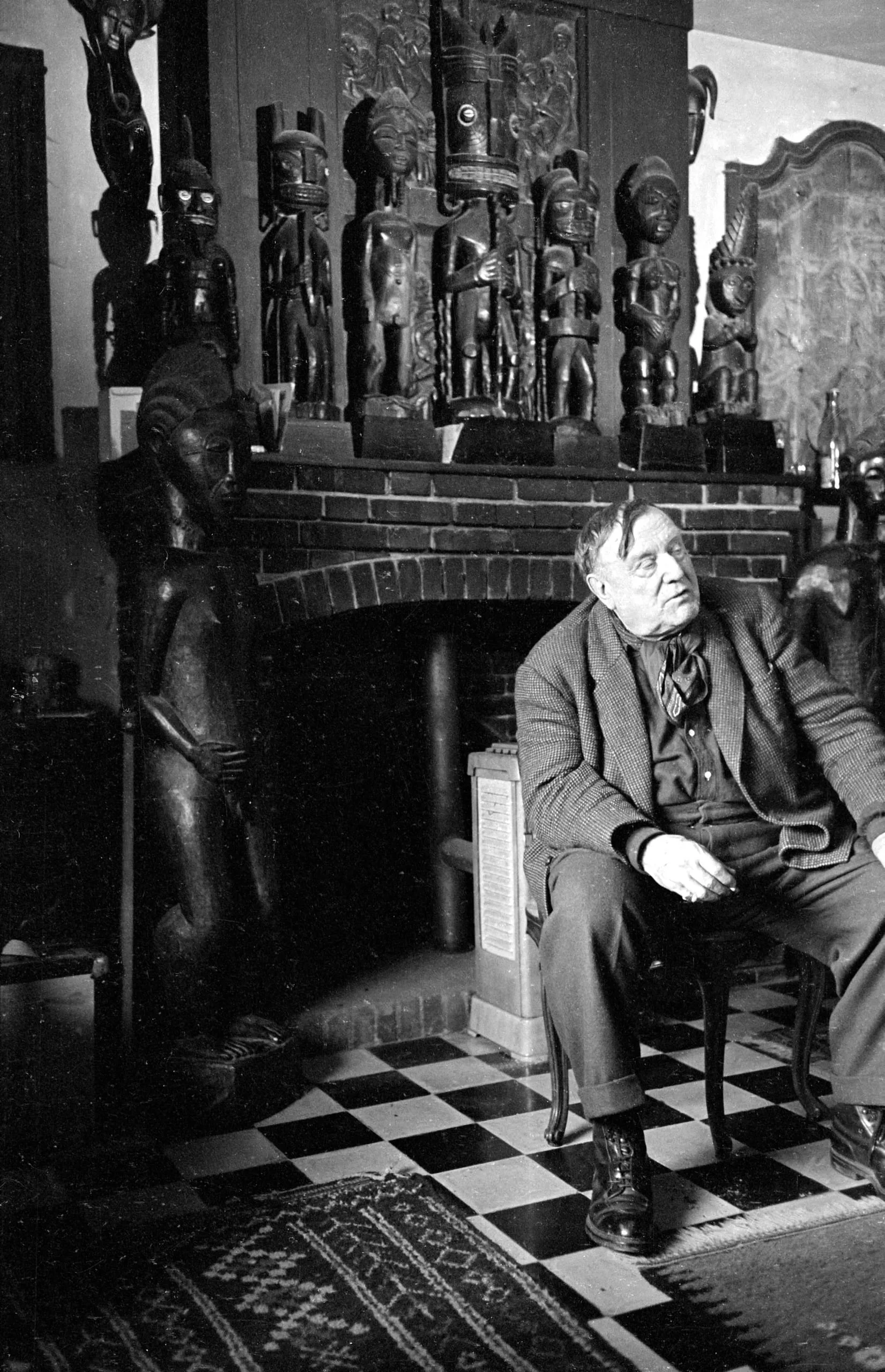 Black and white photograph of a heavyset man seated in a chair before a brick fireplace, surrounded by carved wooden figures on the mantel and floor