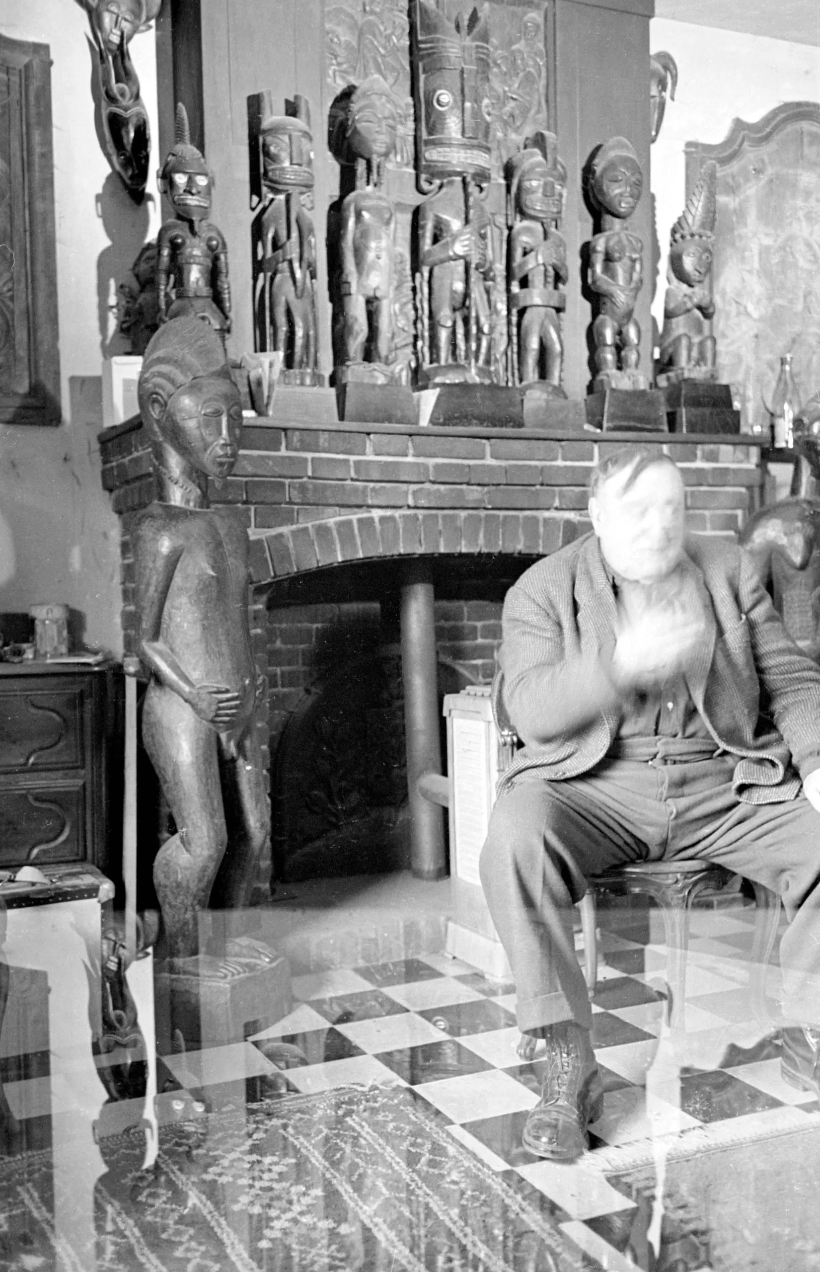 Double-exposed black and white photograph of a man seated in a chair beside a brick fireplace lined with carved wooden figural sculptures