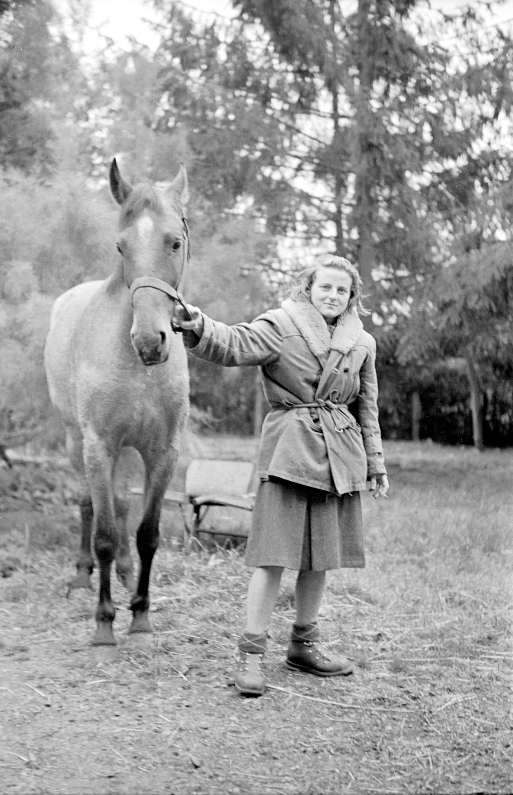 Black and white photograph of a young woman in a belted coat holding a horse by its halter outdoors, with evergreen trees in the distance