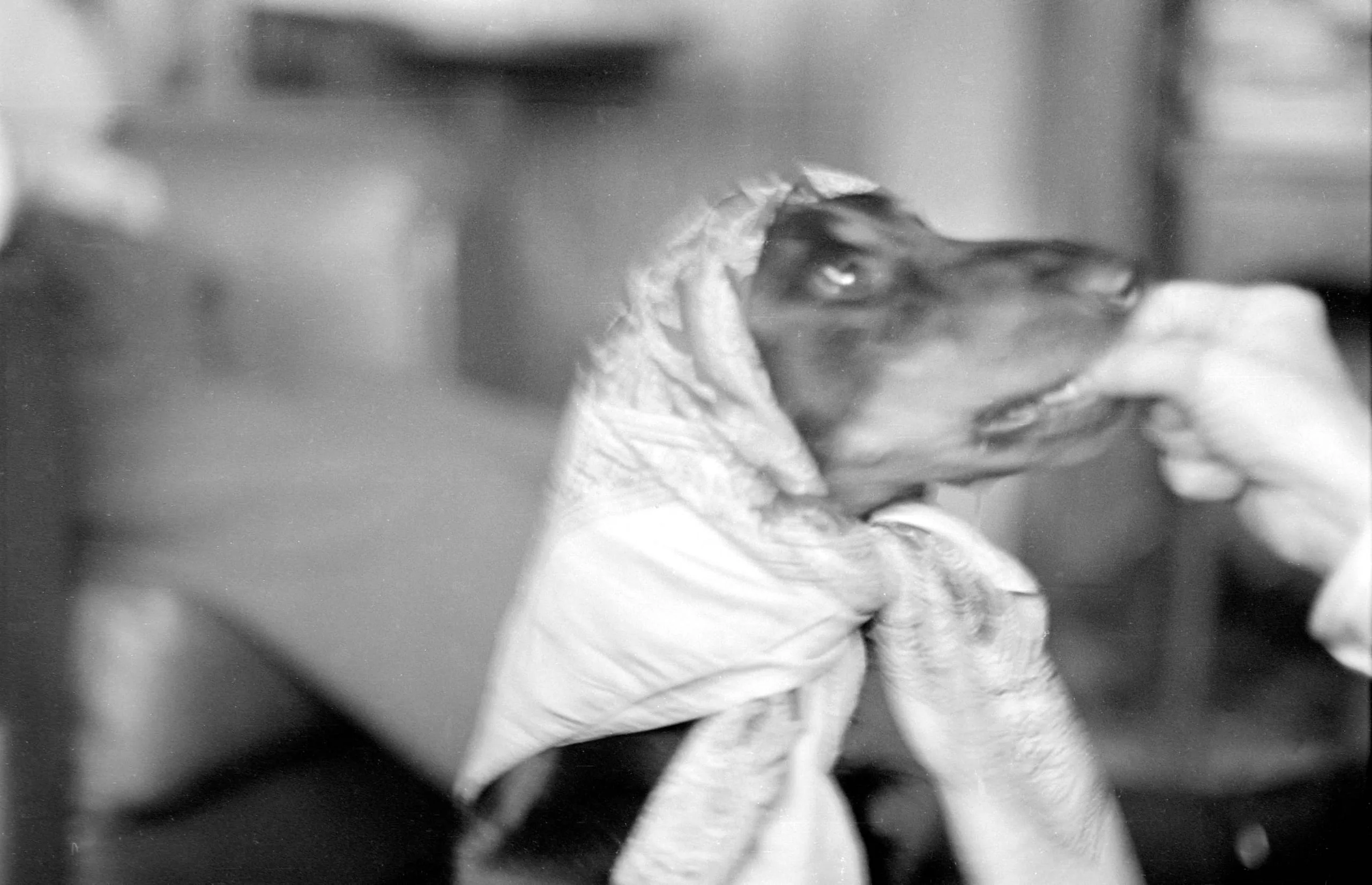 Black and white photograph of a short-haired dog wrapped in a light cloth or towel, held by a pair of hands, shot with soft focus