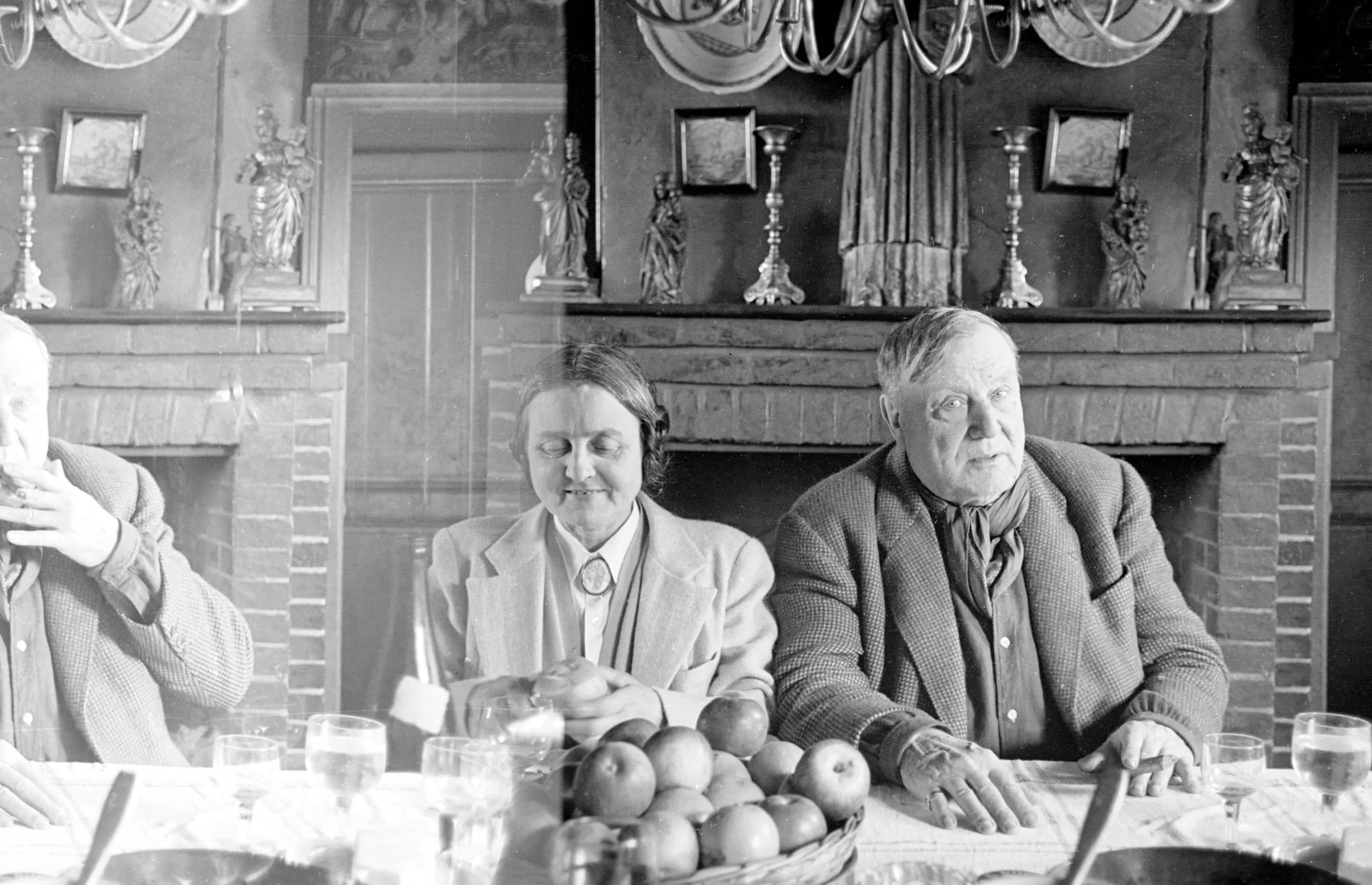Black and white photograph of three people seated at a table with glasses and a fruit basket, two brick fireplaces and decorative figurines visible in the background