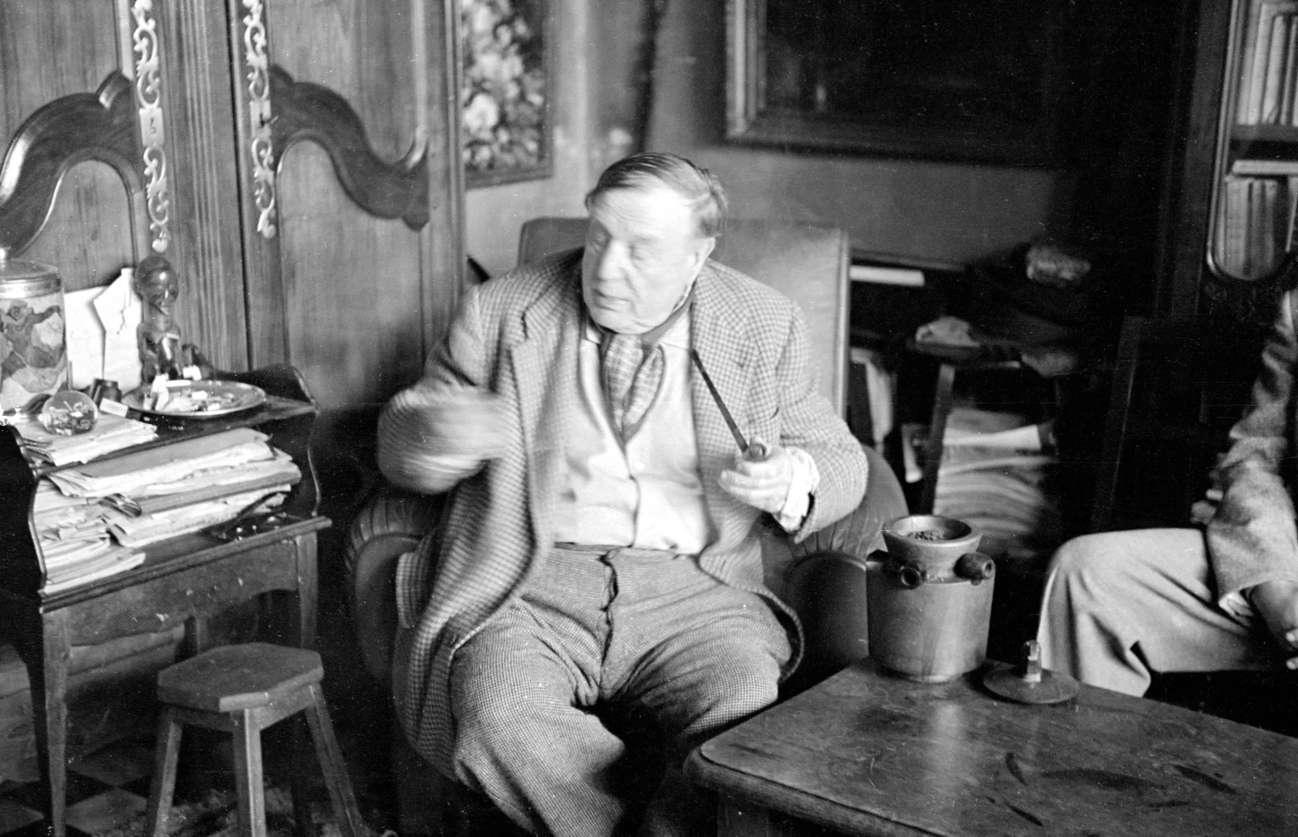 Black and white photograph of a heavyset man seated in an armchair, holding a pipe, one arm blurred in motion, in a wood-paneled room filled with books and objects