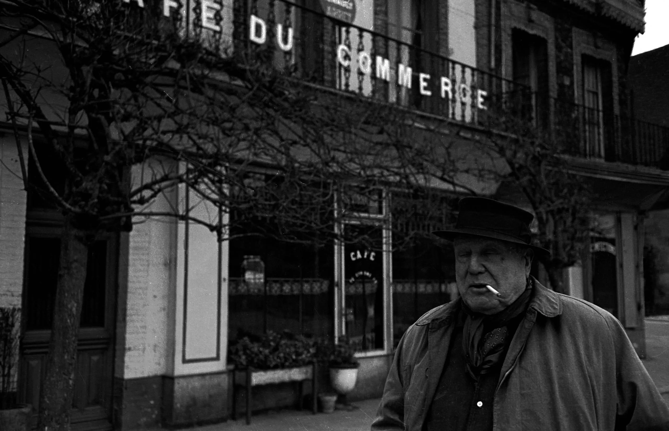 Black and white photograph of an older man in a wide-brimmed hat and overcoat, cigarette between his lips, standing before an out-of-focus café facade reading "CAFE DU COMMERCE"