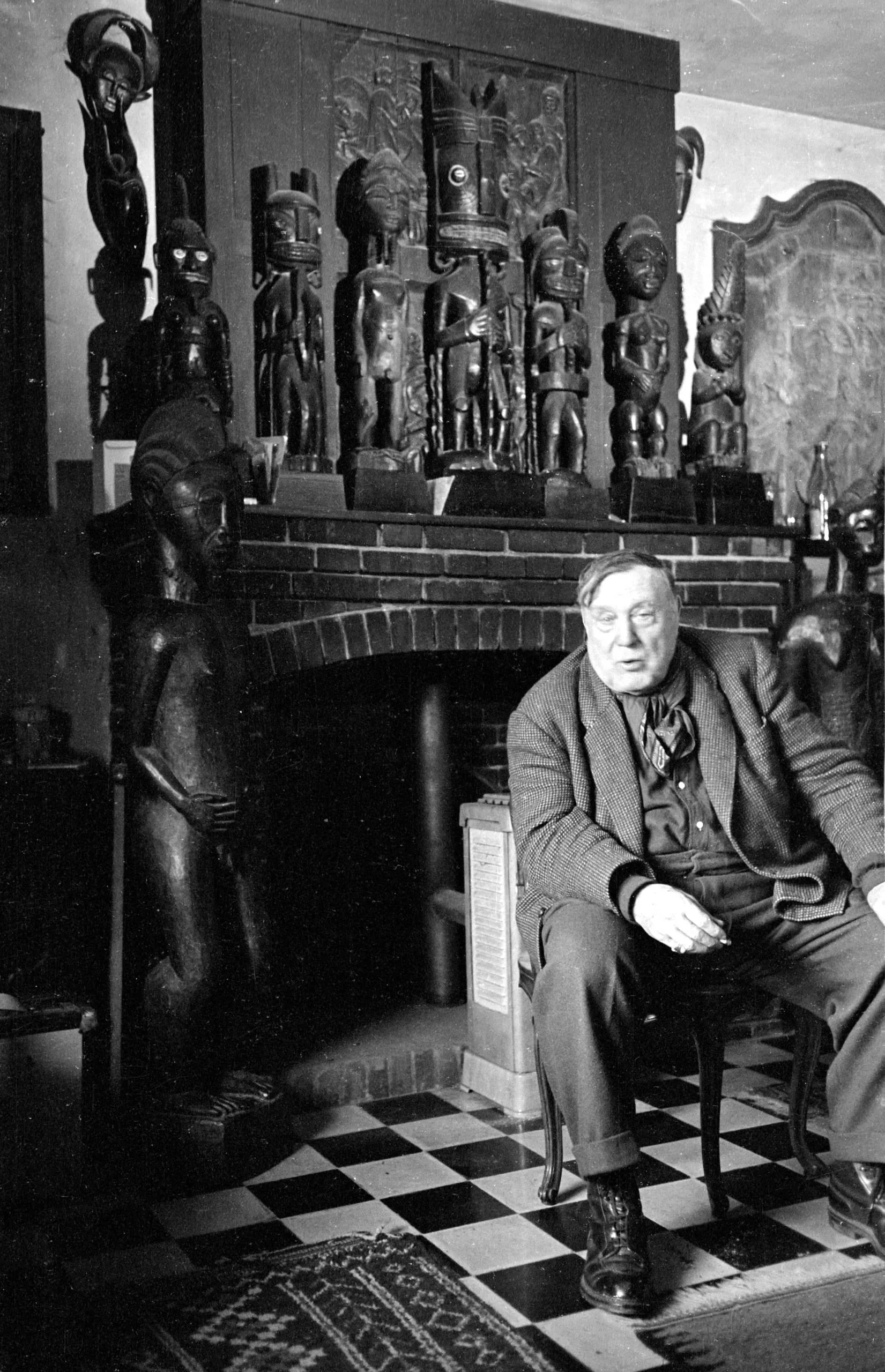 Black and white photograph of a heavyset white man seated before a brick fireplace, surrounded by numerous carved African wooden sculptures on the mantel and floor