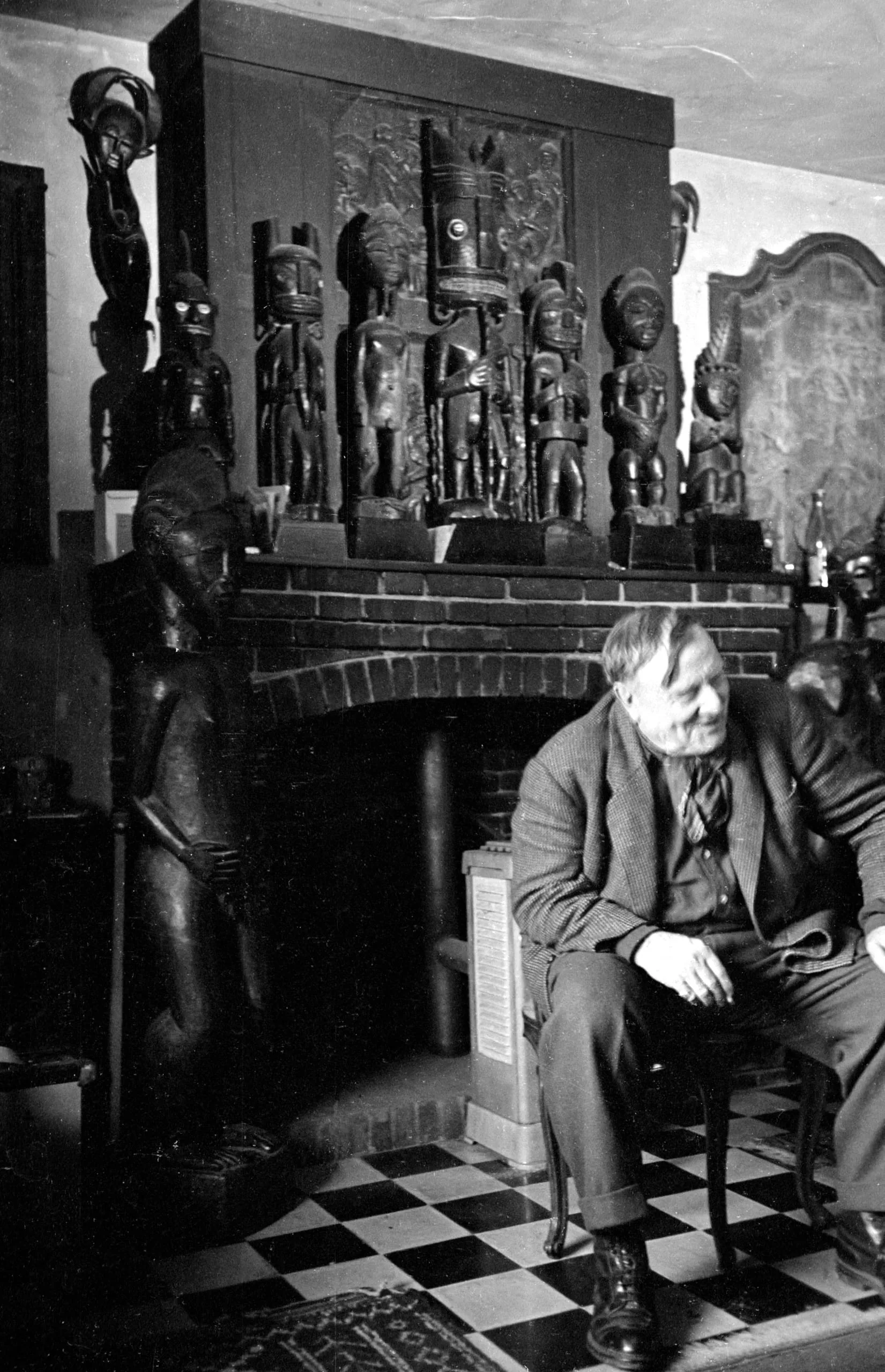 Black and white photograph of an older man seated in a chair, head bowed, in a room with a brick fireplace lined with dark carved wooden figures