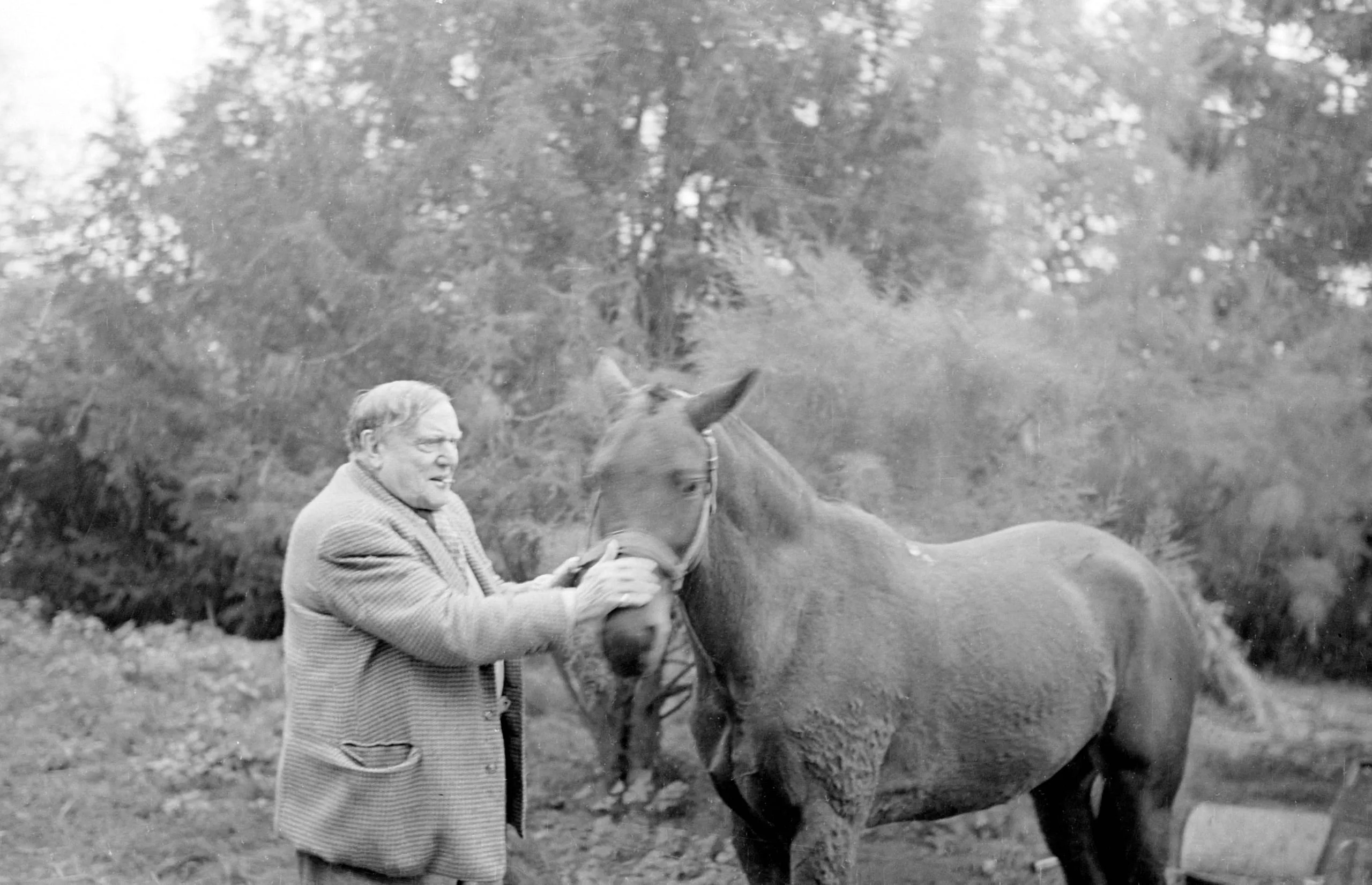 Black and white photograph of a heavyset older man in a sport coat reaching toward the muzzle of a dark horse outdoors, trees in the background