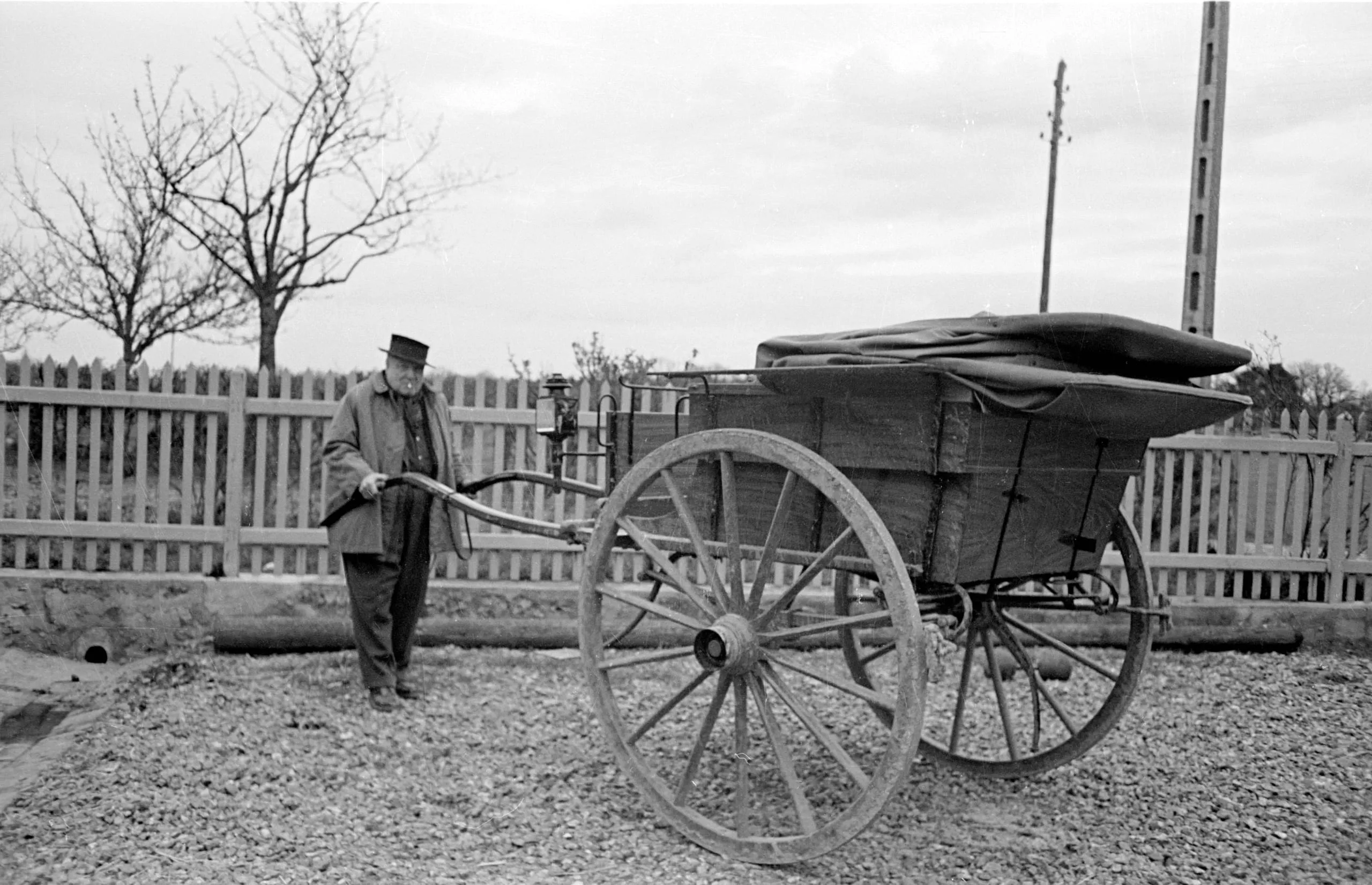 Black and white photograph of an elderly man in a coat and hat gripping the shaft of a two-wheeled wooden cart on a gravel surface, bare tree and picket fence behind