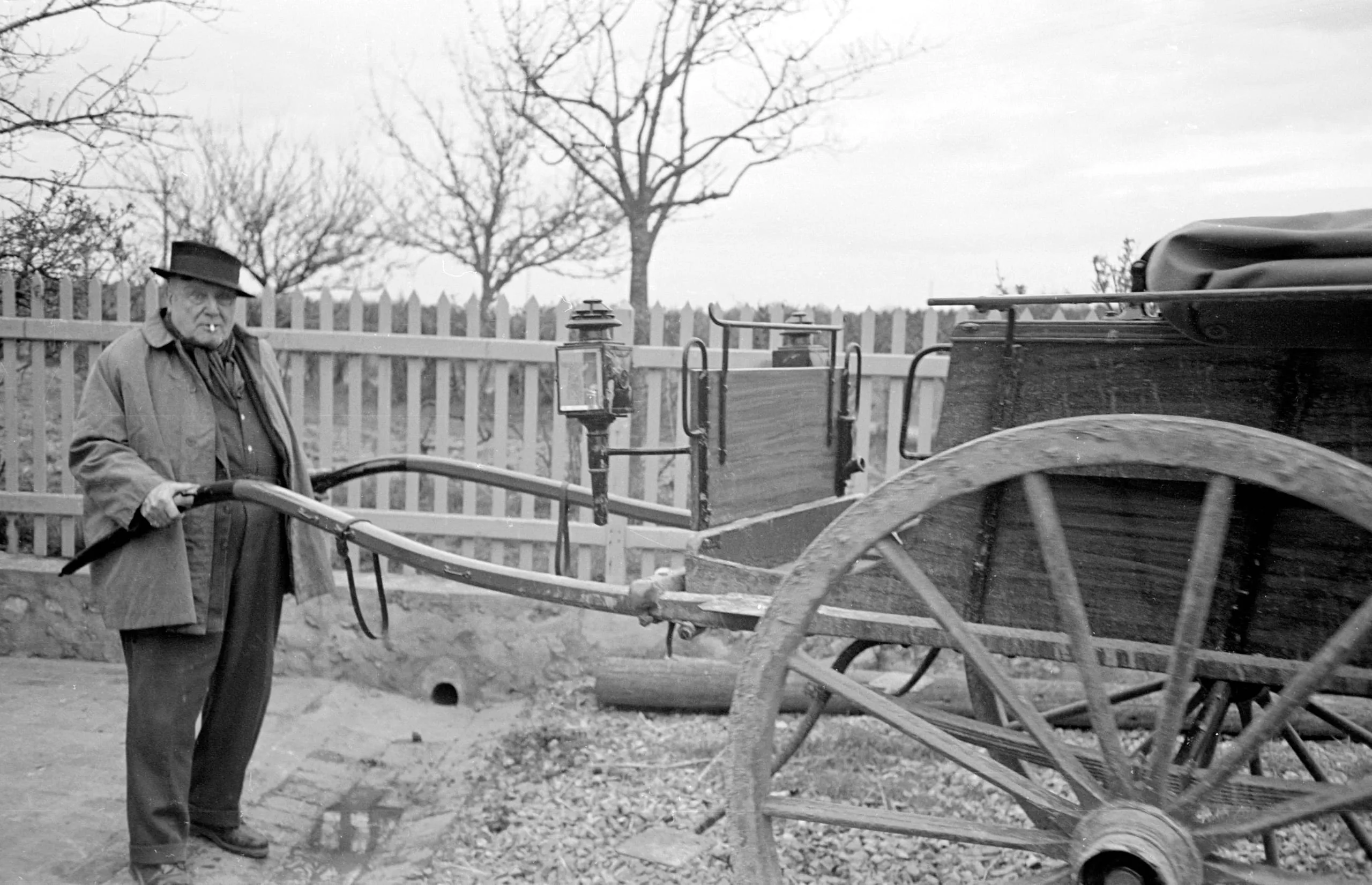 Black and white photograph of an older man in a wide-brimmed hat gripping the shaft of a wooden horse-drawn carriage outdoors, bare trees and picket fence behind him