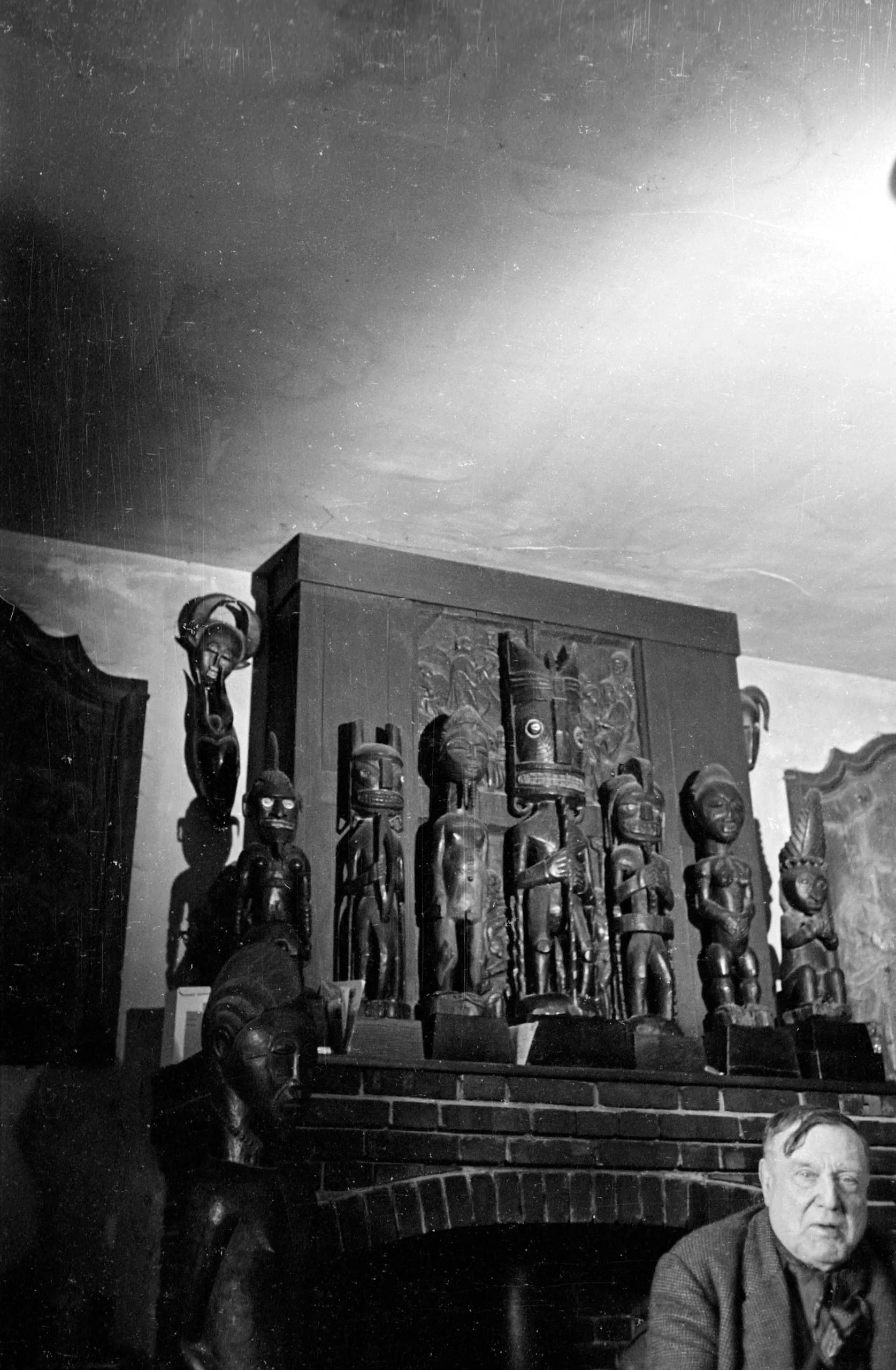 Black and white photograph of a fireplace mantel crowded with carved wooden African figurative sculptures, with a partial view of an older white man in the lower right corner