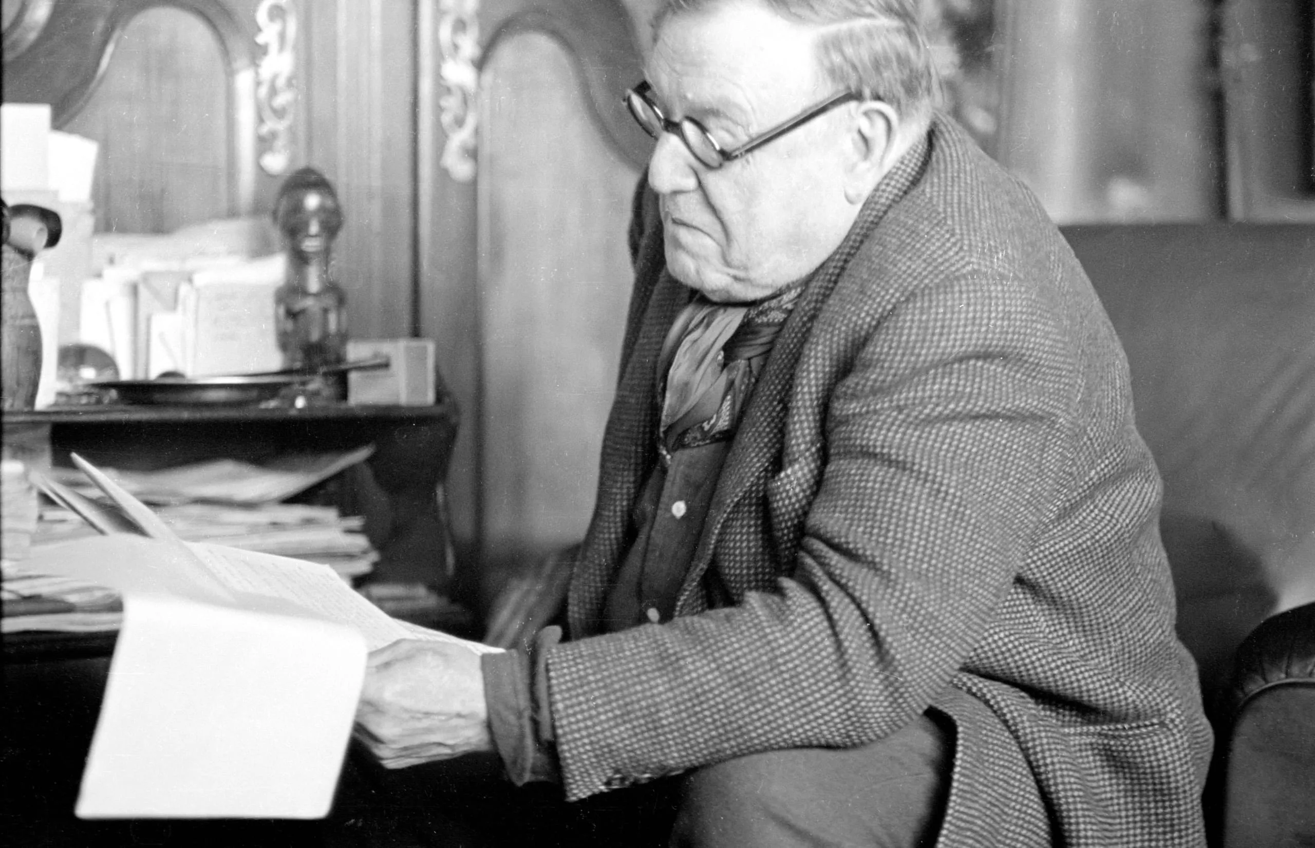 Black and white photograph of an older white man in a tweed jacket and glasses, seated and leaning forward to read papers, with a cluttered desk visible behind him