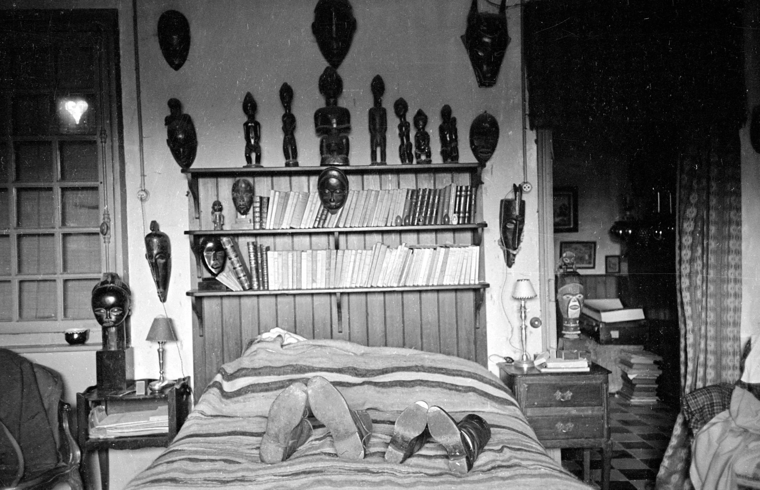 Black and white photograph of a bedroom interior with a striped bed, wooden headboard, bookshelves, and numerous African masks and carved figurines displayed on shelves and walls