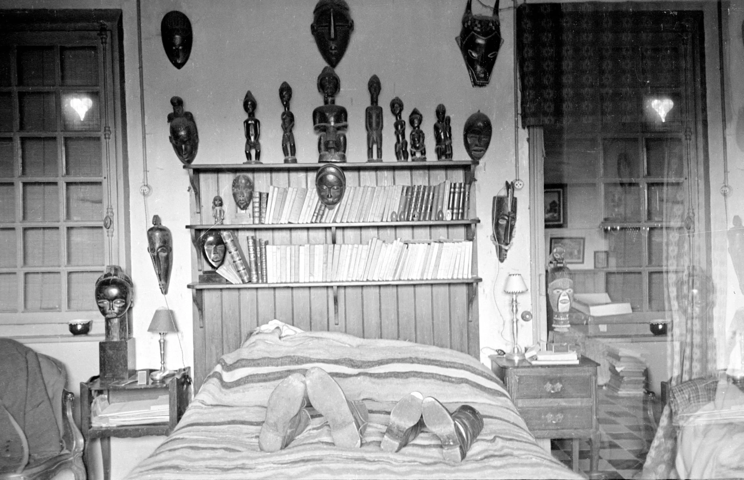 Black and white photograph of a bedroom interior with a striped-blanketed bed, two shoes visible at its foot, a bookcase headboard, and numerous carved African-style figurines and masks displayed on shelves and walls