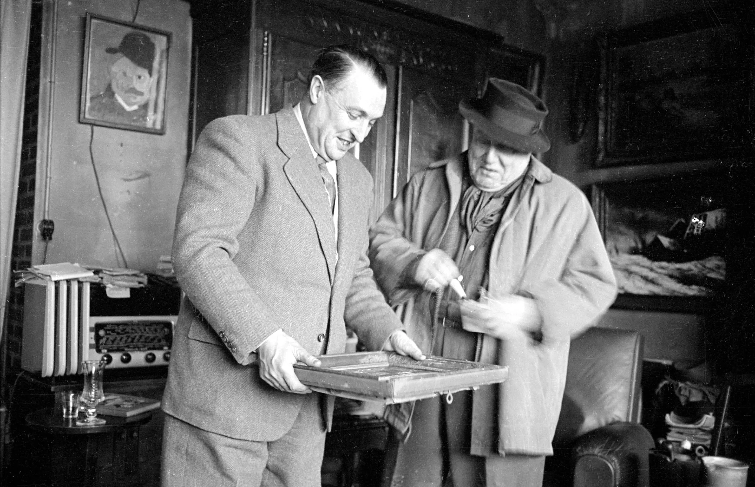Black and white photograph of two men indoors examining a small framed painting, surrounded by artworks, books, and a radio