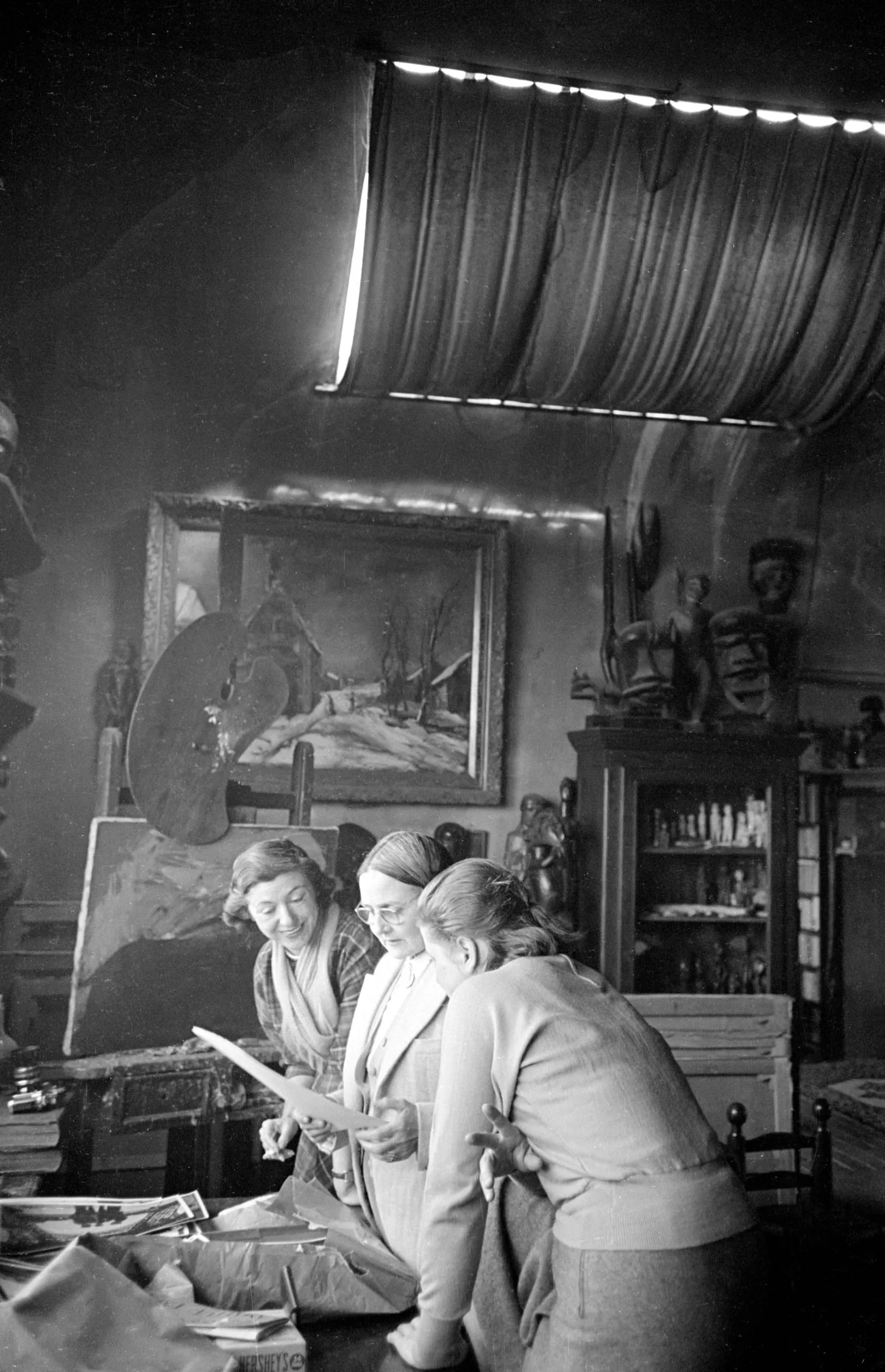 Black and white photograph of three women leaning over a table examining papers in a cluttered artist's studio, with a framed winter landscape painting on the arched wall behind them