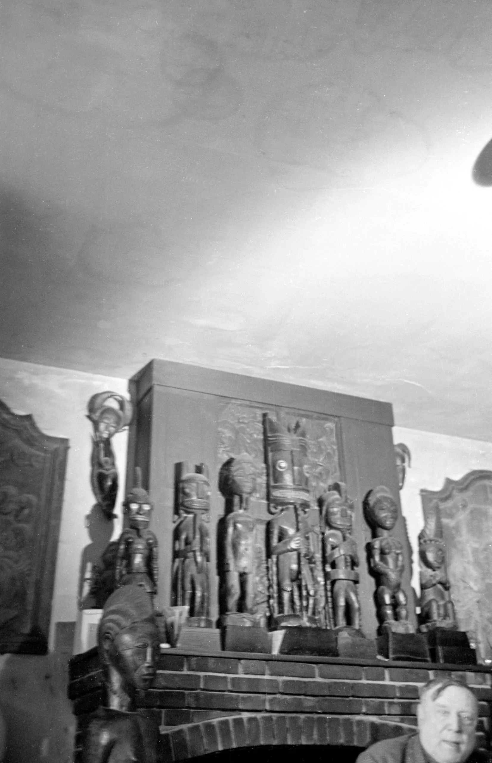 Black and white photograph of multiple carved wooden figural sculptures displayed on a brick fireplace mantel, with a large carved panel behind them