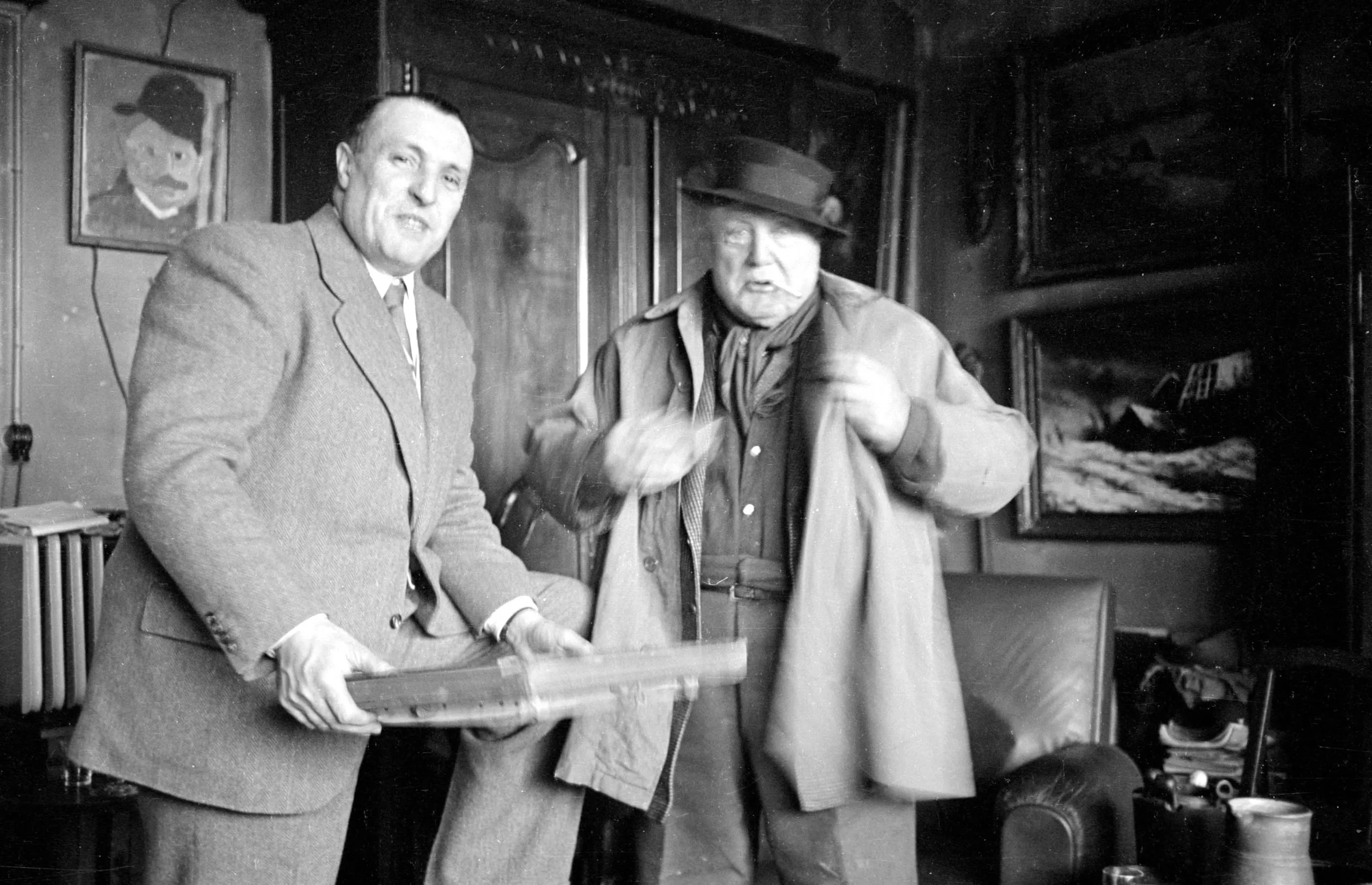 Black and white photograph of two men standing indoors; one holds a long cylindrical tube, the other in a hat and overcoat has motion-blurred arms