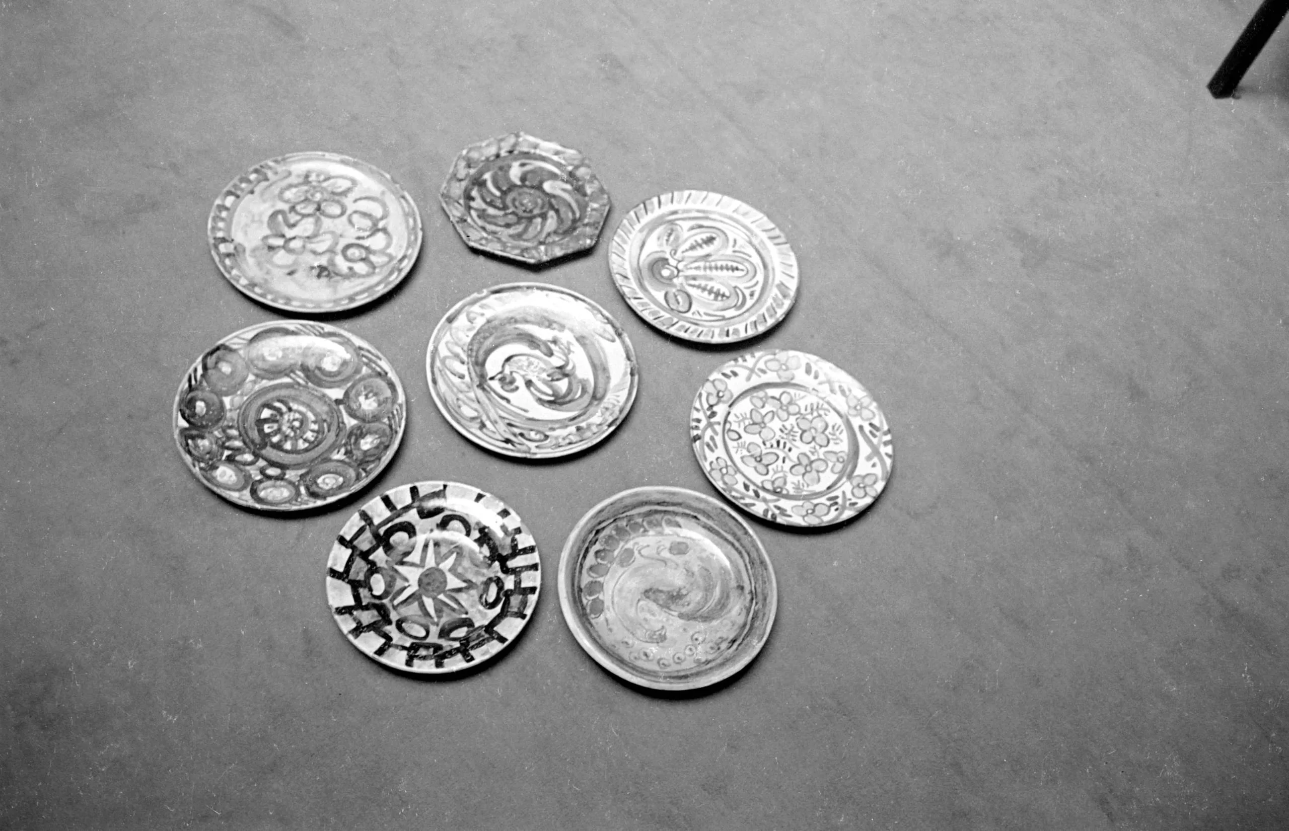 Black and white photograph of eight decorated ceramic plates arranged on a flat surface, each with a distinct raised relief pattern including spirals, floral motifs, birds, and geometric designs