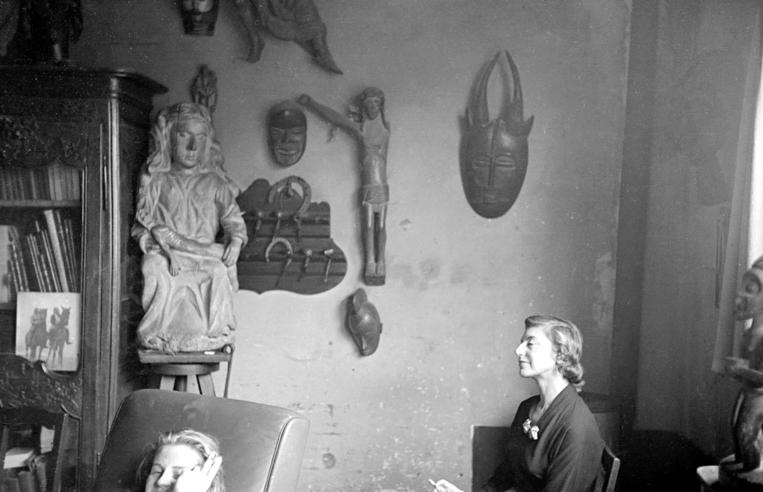 Black and white photograph of a room interior with tribal masks, a carved wooden figure, and a crucifix mounted on a plaster wall, a white woman in profile seated at lower right