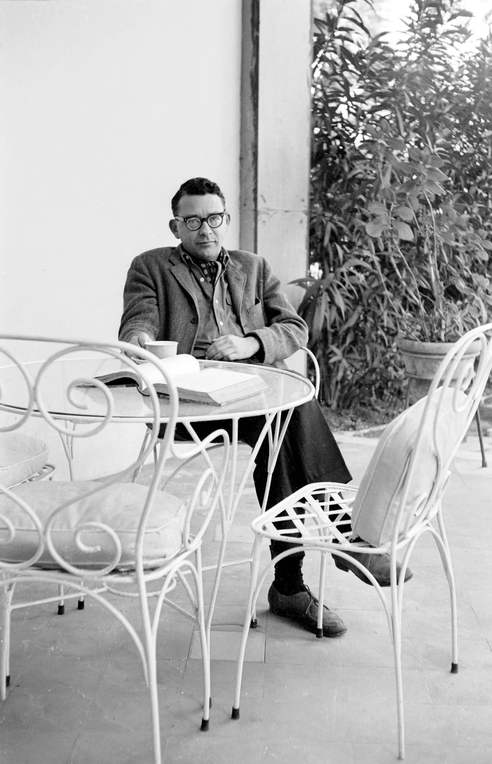 Black and white photograph of a man in glasses and a tweed jacket seated at a glass-topped wrought-iron table on a patio, looking at the camera