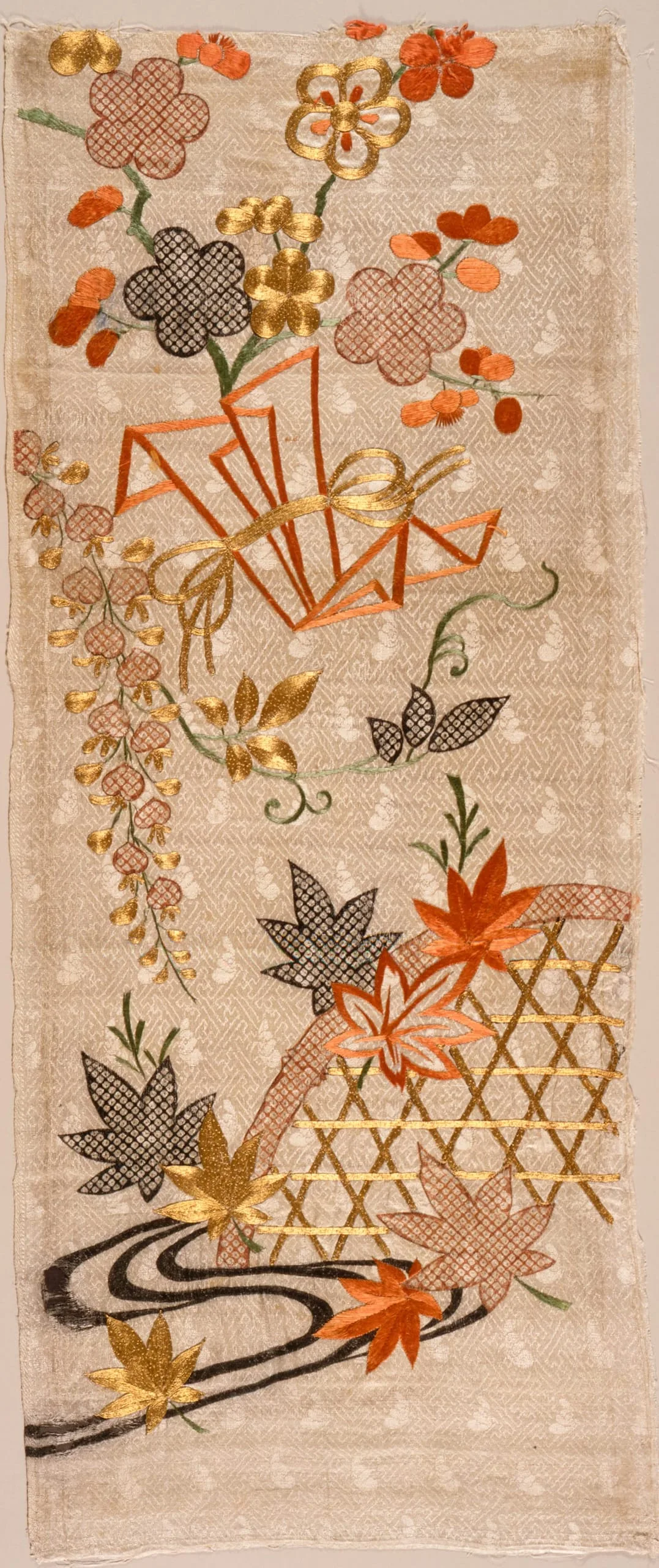- Kosode (Kimono) Fragment with Plum Blossoms, Noshi, Wisteria, Maple Leaves, Bamboo, (...?), and Water
