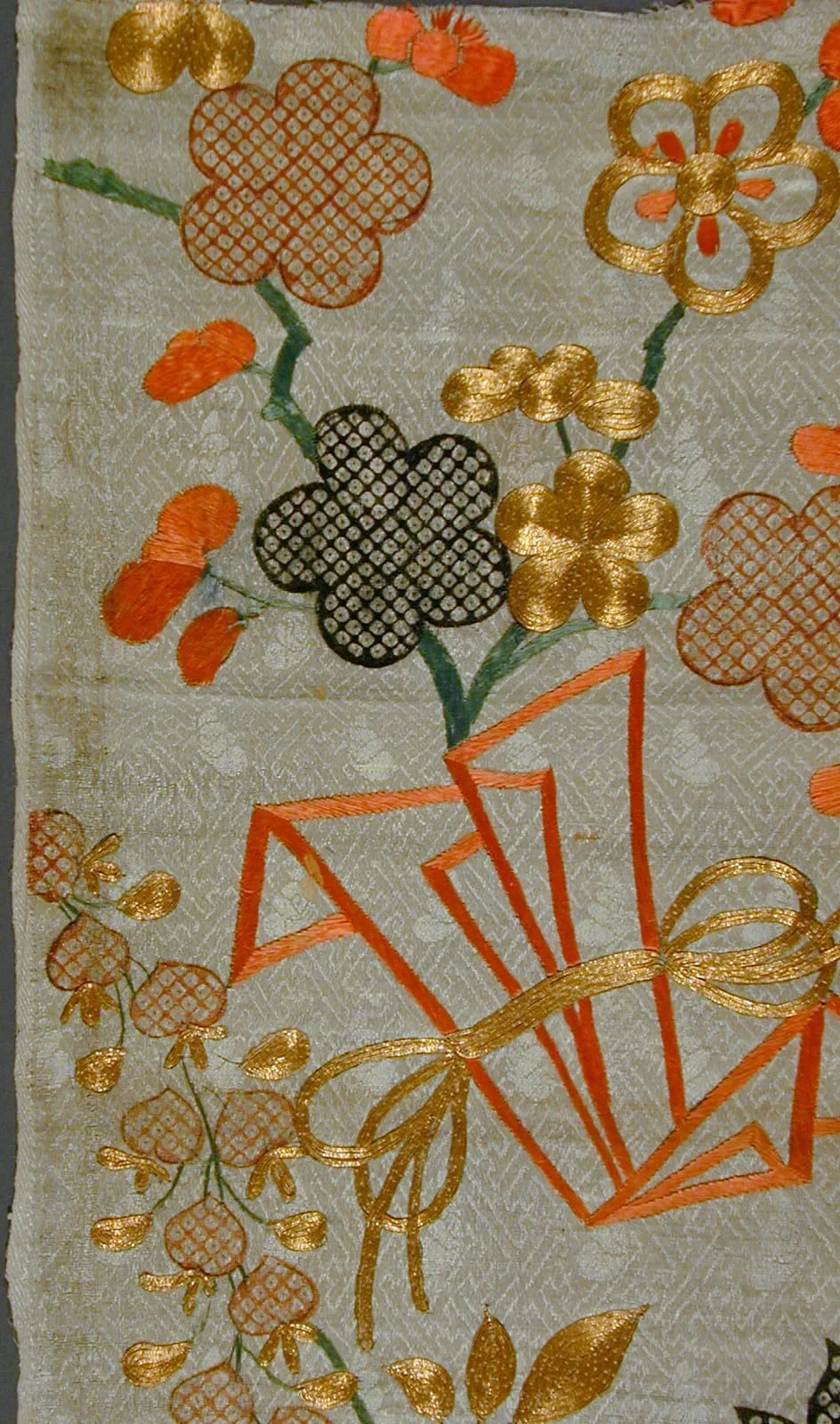 - Silk figured satin (rinzu), stenciled imitation tie-dyed (kata kanako shibori), with silk and gilt-paper-wrapped-silk thread embroidery, and stenciled dyed