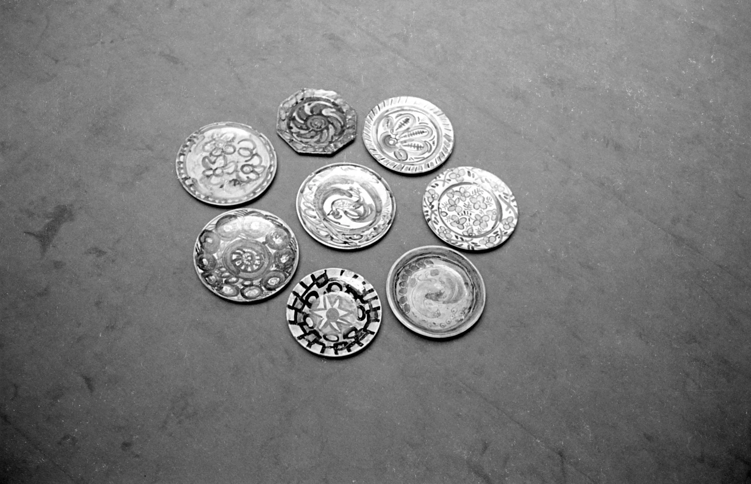 Black and white photograph of nine circular metal discs arranged in a diamond formation, each embossed with a different decorative relief pattern