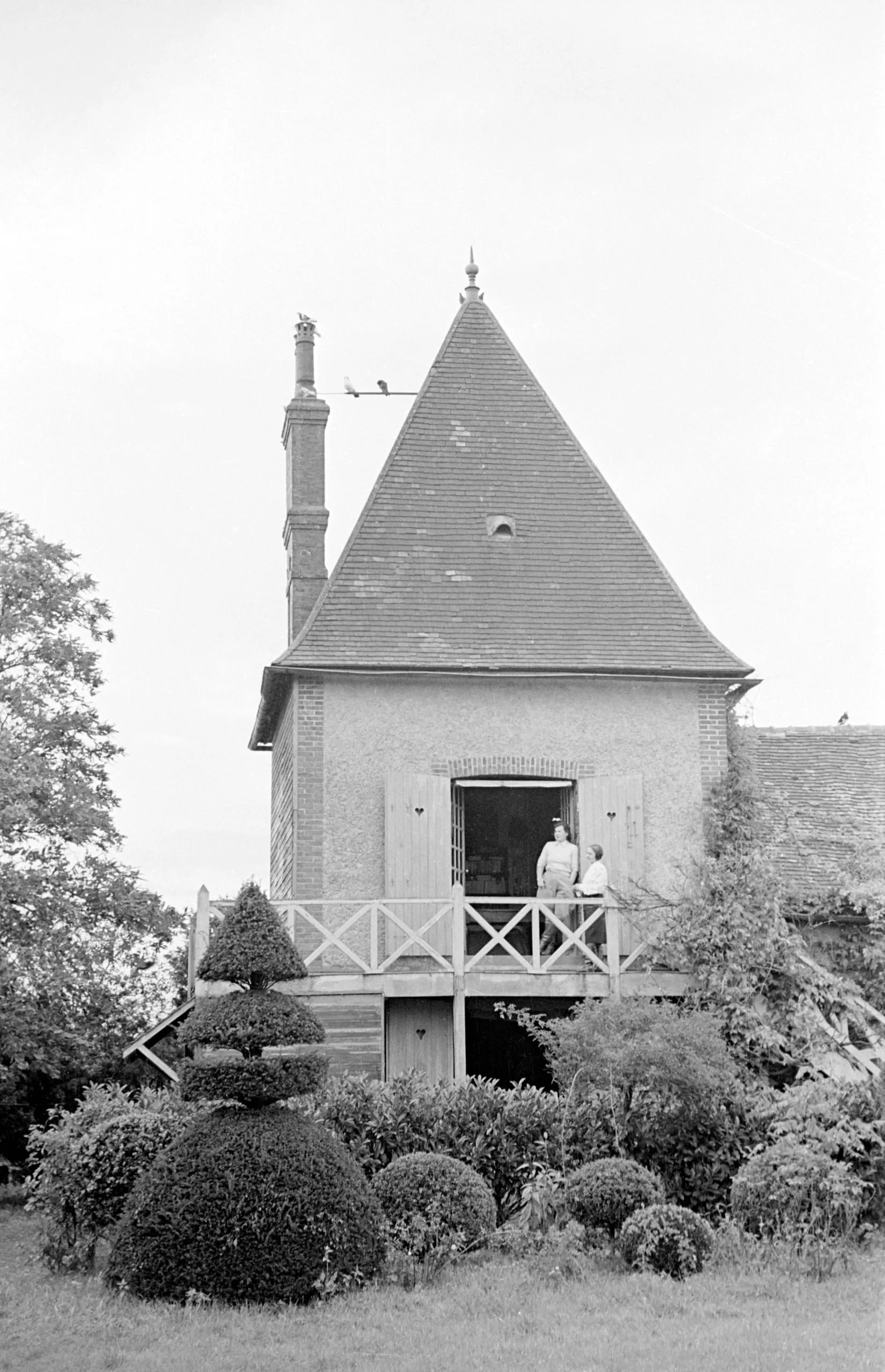 Black and white photograph of a two-story stucco building with a steep pyramidal roof and white-railed balcony, two figures standing in the doorway, neatly clipped shrubs in the foreground