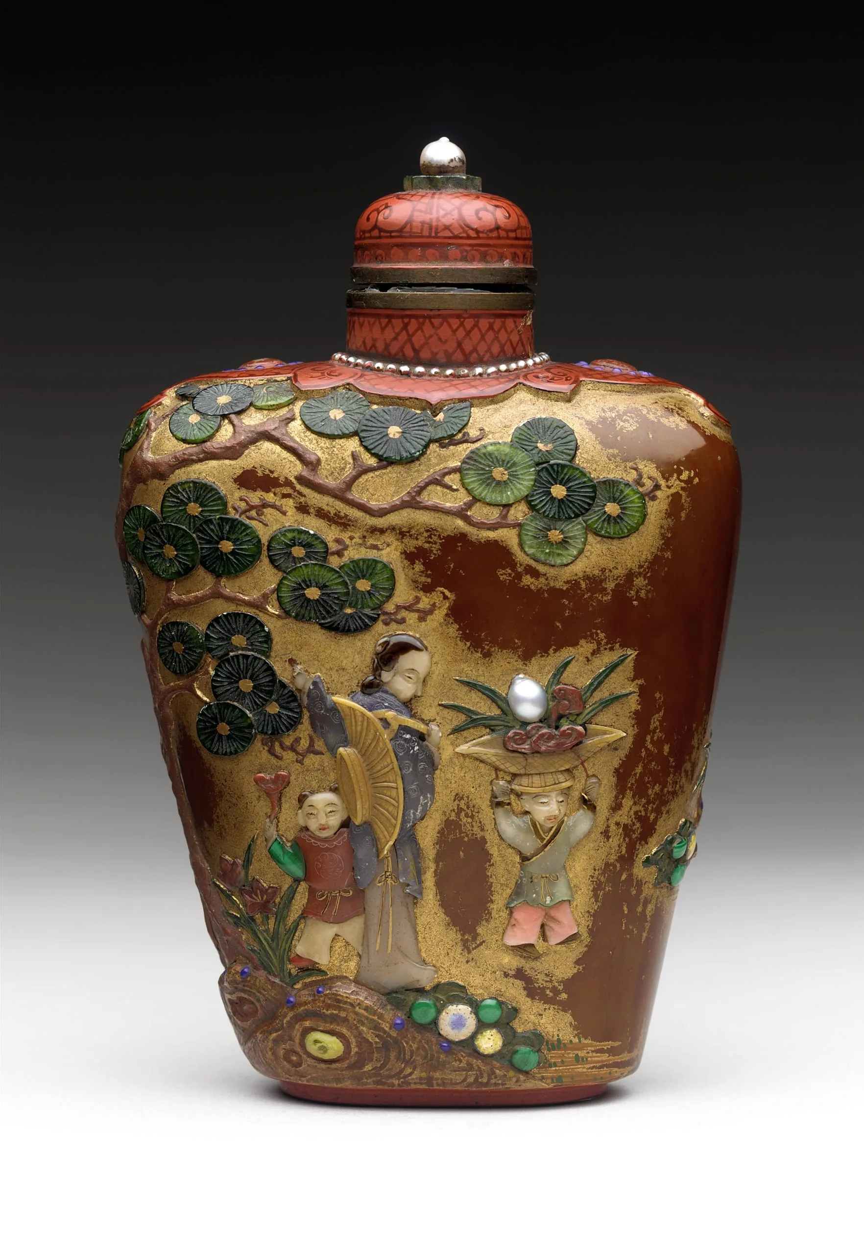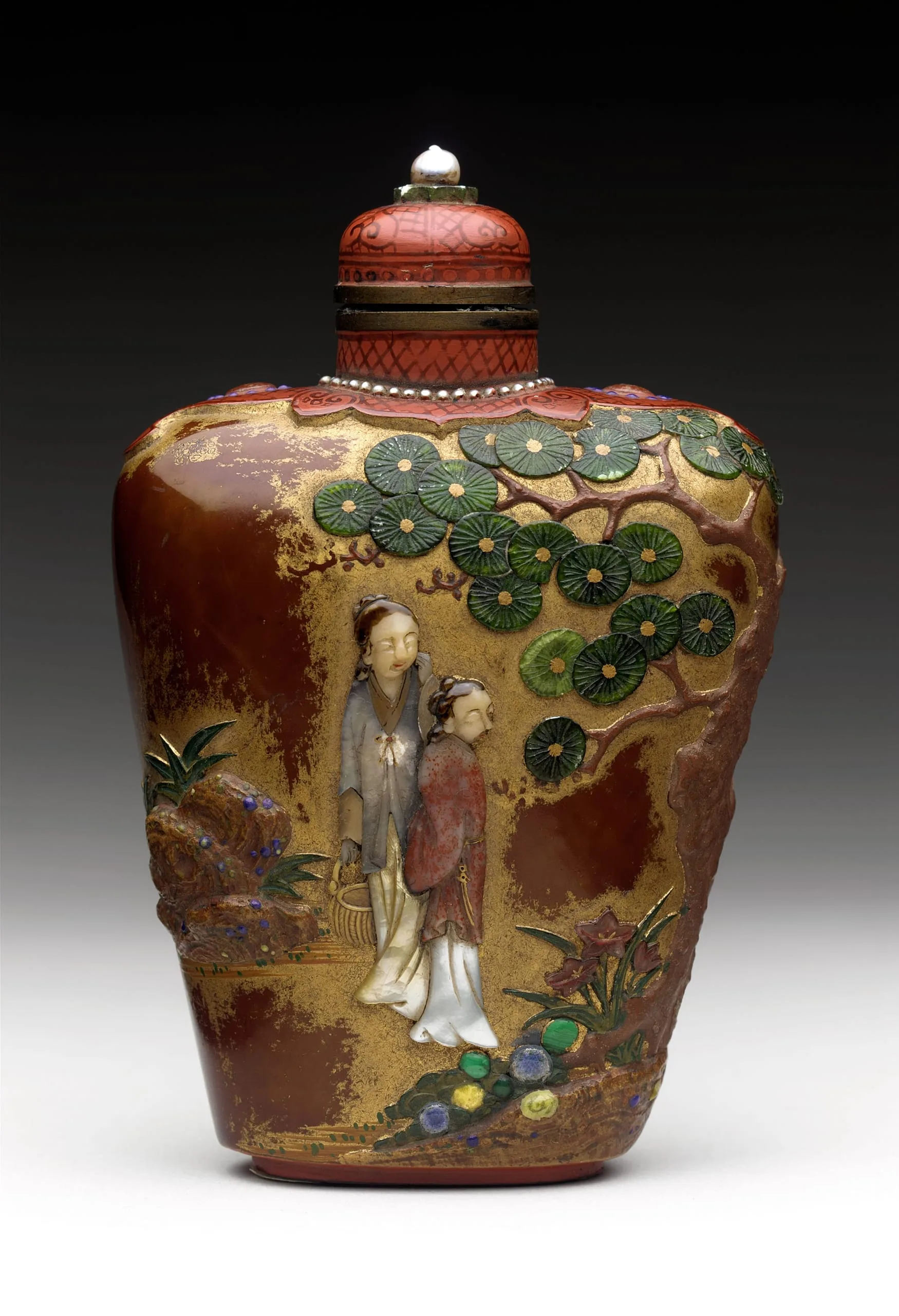 - Red and brown lacquer on a metal core decorated with gilt, mother-of-pearl, soapstone, malachite, and pearl overlay, with matching lacquered stopper